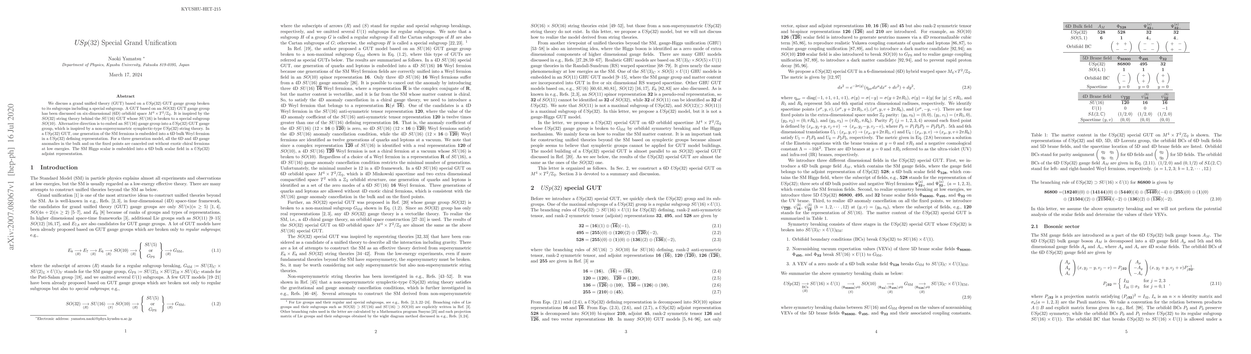 We discuss a grand unified theory (GUT) based on a $USp(32)$ GUT gauge group broken to its subgroups including a special subgroup. A GUT based on an $SO(32)$ GUT gauge group has been discussed on six-dimensional (6D) orbifold space $M^4\times T^2/\mathbb{Z}_2$. It is inspired by the $SO(32)$ string theory behind the $SU(16)$ GUT whose $SU(16)$ is broken to a special subgroup $SO(10)$. Alternative direction is to embed an $SU(16)$ gauge group into a $USp(32)$ GUT gauge group, which is inspired by a non-supersymmetric symplectic-type $USp(32)$ string theory. In a $USp(32)$ GUT, one generation of the SM fermions is embedded into a 6D bulk Weyl fermion in a $USp(32)$ defining representation. For a three generation model, all the 6D and 4D gauge anomalies in the bulk and on the fixed points are canceled out without exotic chiral fermions at low energies. The SM Higgs scalar is embedded into a 6D bulk scalar field in a $USp(32)$ adjoint representation.