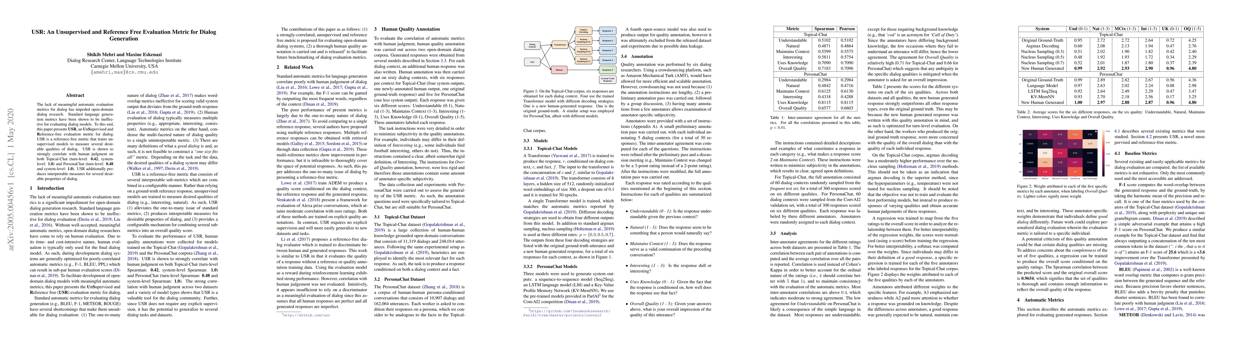 This paper introduces USR, an unsupervised and reference-free evaluation metric for dialog generation, which trains models to assess dialog quality without human-generated references. USR correlates strongly with human judgments and provides interpretable measures for various dialog properties.
