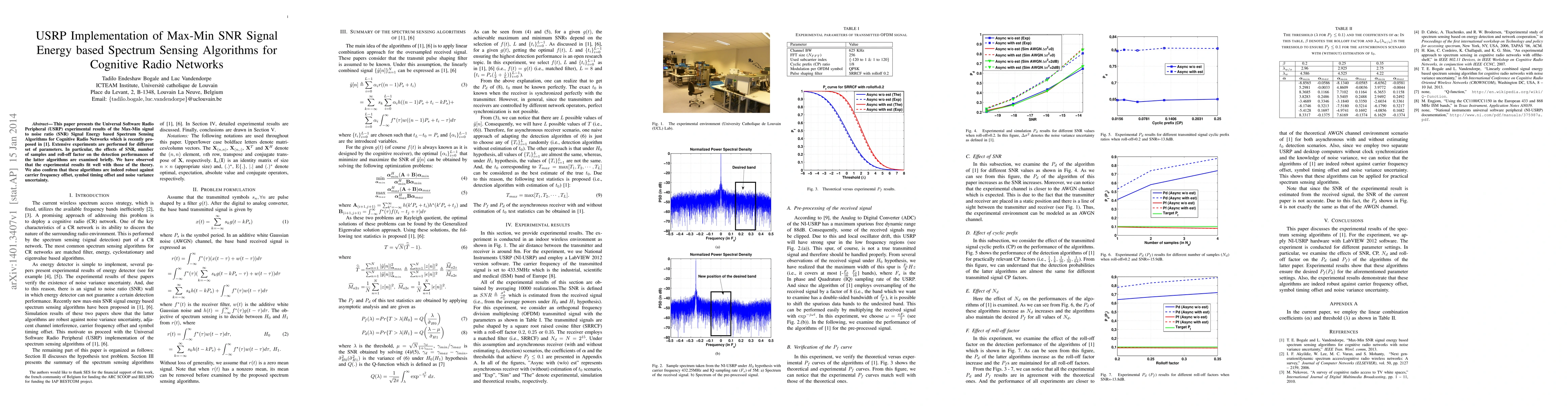 This paper presents USRP experimental results for Max-Min SNR Signal Energy based Spectrum Sensing Algorithms in Cognitive Radio Networks, confirming their robustness against various offsets and uncertainties. The results align well with theoretical predictions, highlighting the algorithms' effectiveness under different parameters.