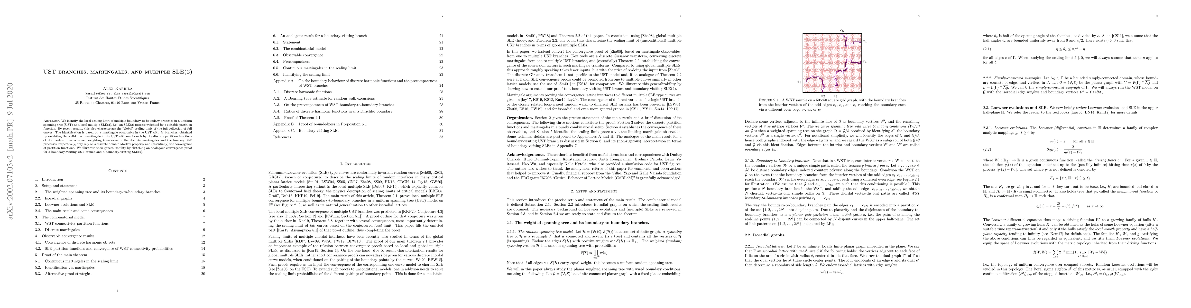 The paper introduces a martingale approach to characterize the scaling limits of multiple UST branches, linking discrete models to continuous SLE processes through partition functions.