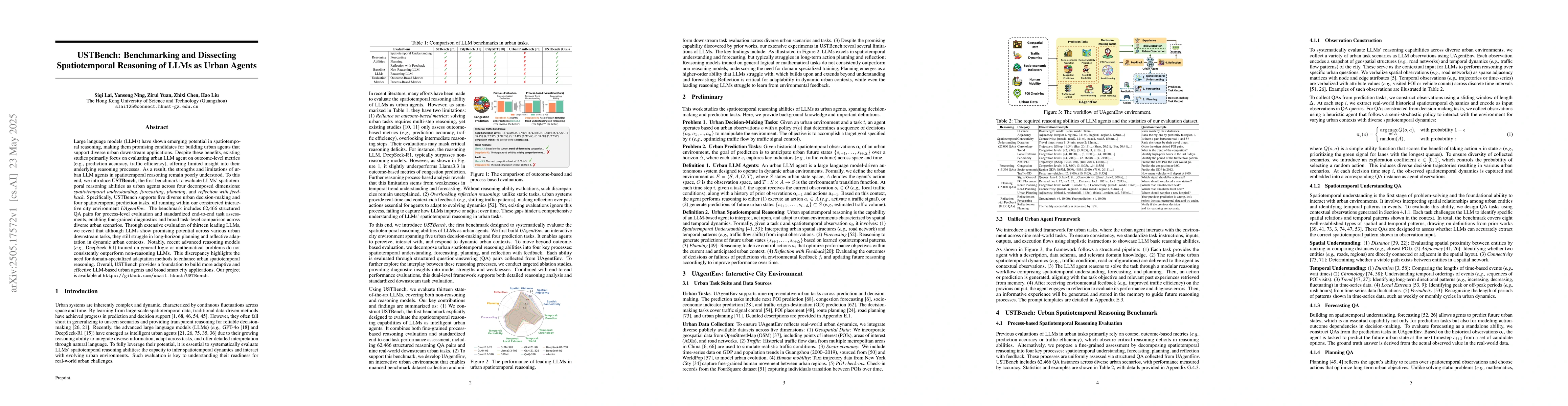 USTBench is the first benchmark to decompose and evaluate LLMs' spatiotemporal reasoning abilities in urban contexts across understanding, forecasting, planning, and reflection with feedback dimensions.