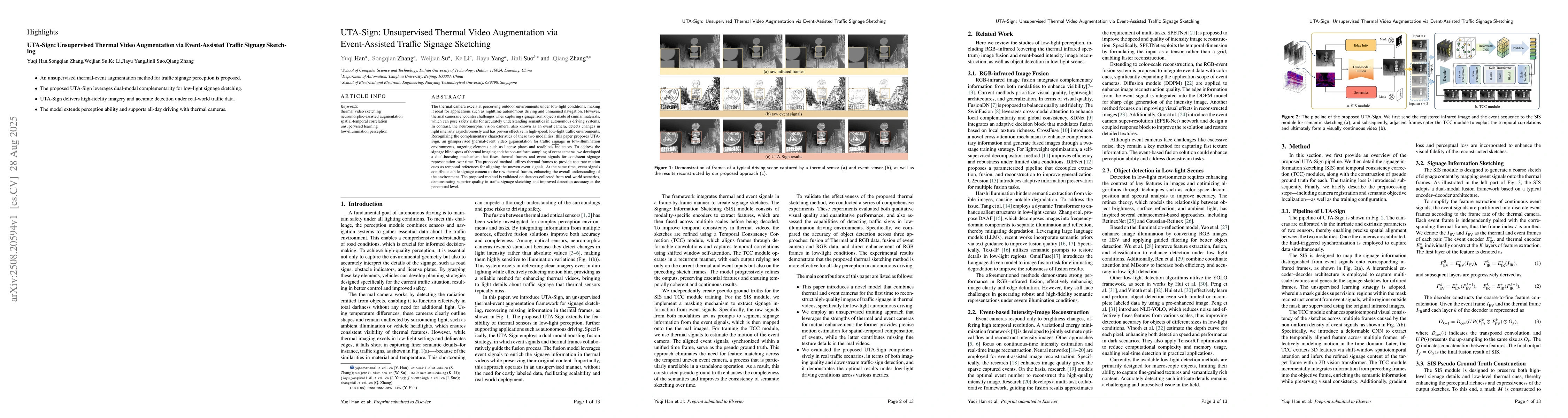 The thermal camera excels at perceiving outdoor environments under low-light conditions, making it ideal for applications such as nighttime autonomous driving and unmanned navigation. However, thermal cameras encounter challenges when capturing signage from objects made of similar materials, which can pose safety risks for accurately understanding semantics in autonomous driving systems. In contrast, the neuromorphic vision camera, also known as an event camera, detects changes in light intensity asynchronously and has proven effective in high-speed, low-light traffic environments. Recognizing the complementary characteristics of these two modalities, this paper proposes UTA-Sign, an unsupervised thermal-event video augmentation for traffic signage in low-illumination environments, targeting elements such as license plates and roadblock indicators. To address the signage blind spots of thermal imaging and the non-uniform sampling of event cameras, we developed a dual-boosting mechanism that fuses thermal frames and event signals for consistent signage representation over time. The proposed method utilizes thermal frames to provide accurate motion cues as temporal references for aligning the uneven event signals. At the same time, event signals contribute subtle signage content to the raw thermal frames, enhancing the overall understanding of the environment. The proposed method is validated on datasets collected from real-world scenarios, demonstrating superior quality in traffic signage sketching and improved detection accuracy at the perceptual level.