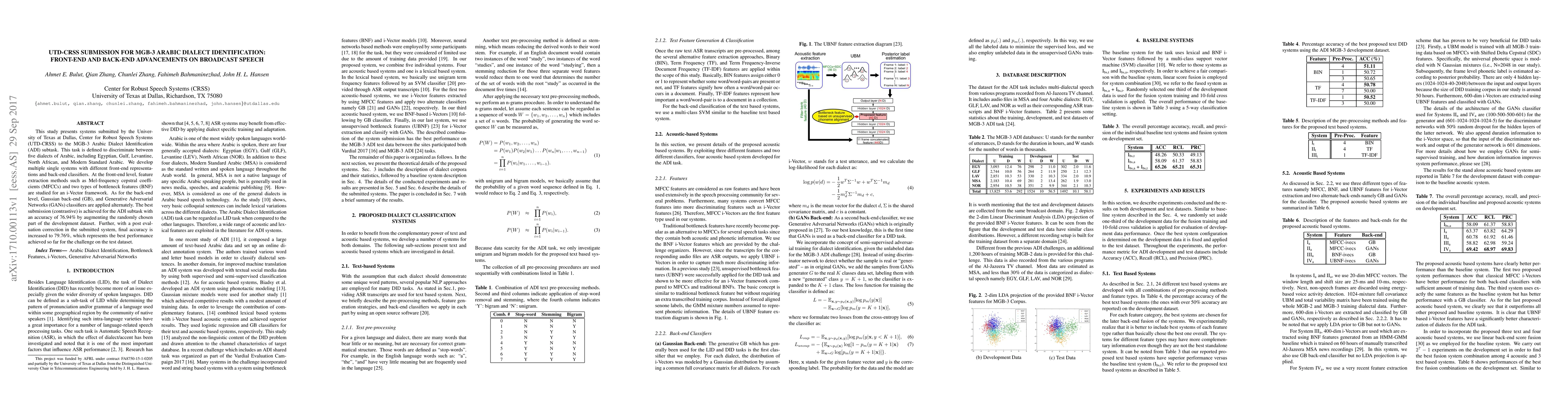 This study from UTD-CRSS explores advanced front-end and back-end techniques for identifying five Arabic dialects in broadcast speech, achieving a best-performing accuracy of 79.76% through feature extraction methods and classifiers like MFCCs, BNF, GB, and GANs.