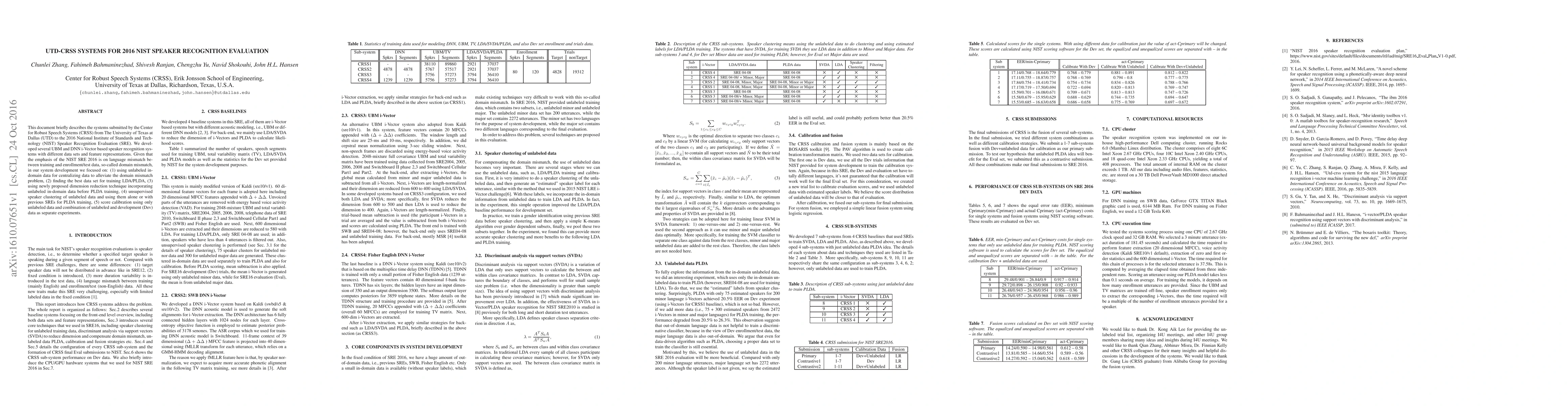 The UTD-CRSS systems submitted to the 2016 NIST SRE focused on addressing domain mismatch through various strategies, including utilizing unlabeled in-domain data, optimizing dataset selection for LDA/PLDA training, and employing dimension reduction techniques and unsupervised speaker clustering.