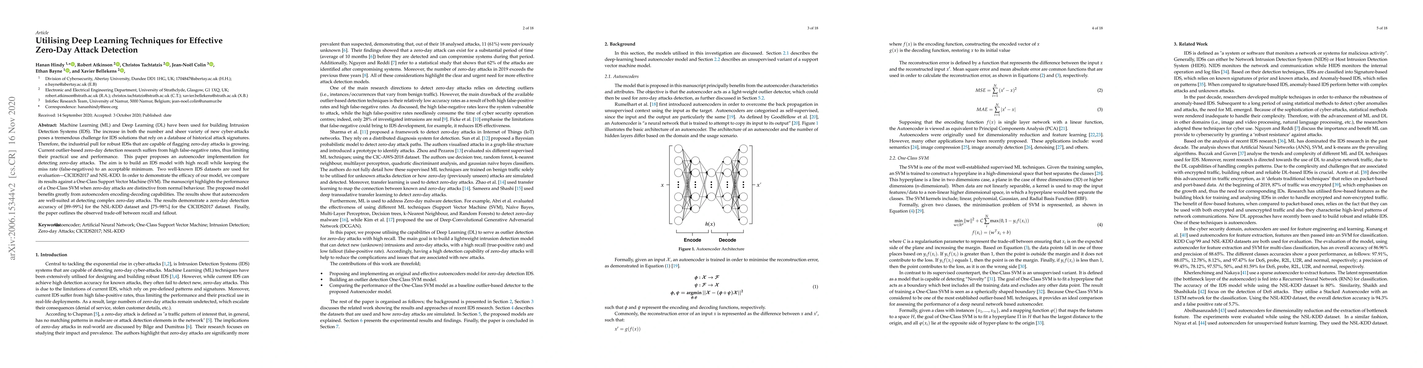 Machine Learning (ML) and Deep Learning (DL) have been used for building Intrusion Detection Systems (IDS). The increase in both the number and sheer variety of new cyber-attacks poses a tremendous challenge for IDS solutions that rely on a database of historical attack signatures. Therefore, the industrial pull for robust IDSs that are capable of flagging zero-day attacks is growing. Current outlier-based zero-day detection research suffers from high false-negative rates, thus limiting their practical use and performance. This paper proposes an autoencoder implementation for detecting zero-day attacks. The aim is to build an IDS model with high recall while keeping the miss rate (false-negatives) to an acceptable minimum. Two well-known IDS datasets are used for evaluation-CICIDS2017 and NSL-KDD. In order to demonstrate the efficacy of our model, we compare its results against a One-Class Support Vector Machine (SVM). The manuscript highlights the performance of a One-Class SVM when zero-day attacks are distinctive from normal behaviour. The proposed model benefits greatly from autoencoders encoding-decoding capabilities. The results show that autoencoders are well-suited at detecting complex zero-day attacks. The results demonstrate a zero-day detection accuracy of [89-99%] for the NSL-KDD dataset and [75-98%] for the CICIDS2017 dataset. Finally, the paper outlines the observed trade-off between recall and fallout.