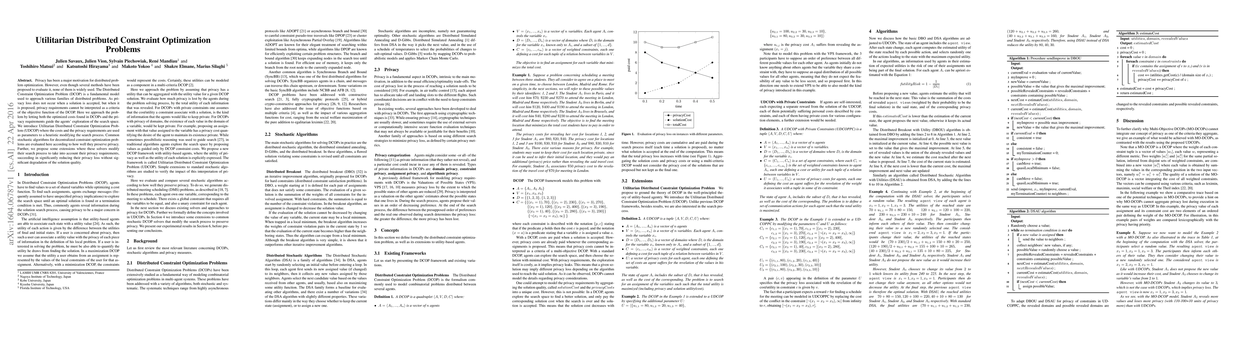 This paper introduces the Utilitarian Distributed Constraint Optimization Problem (UDCOP) to address privacy in distributed optimization. It evaluates existing stochastic algorithms for DCOPs, proposing modifications that significantly reduce privacy loss while maintaining solution quality.