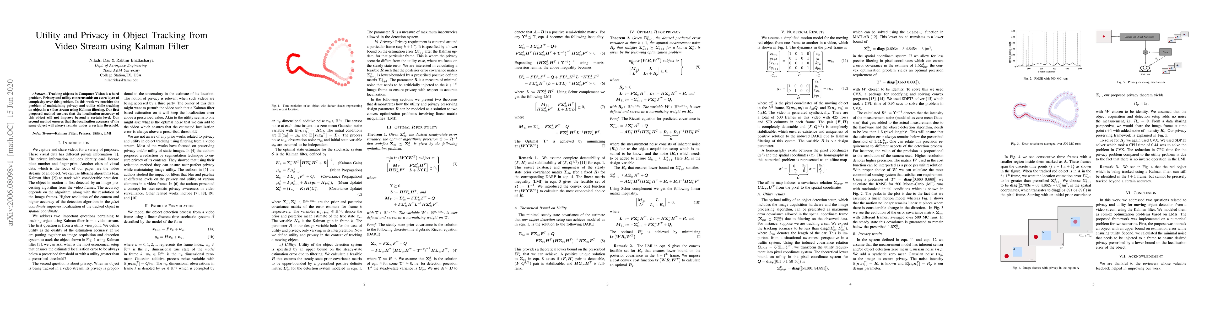 Tracking objects in Computer Vision is a hard problem. Privacy and utility concerns adds an extra layer of complexity over this problem. In this work we consider the problem of maintaining privacy and utility while tracking an object in a video stream using Kalman filtering. Our first proposed method ensures that the localization accuracy of this object will not improve beyond a certain level. Our second method ensures that the localization accuracy of the same object will always remain under a certain threshold.