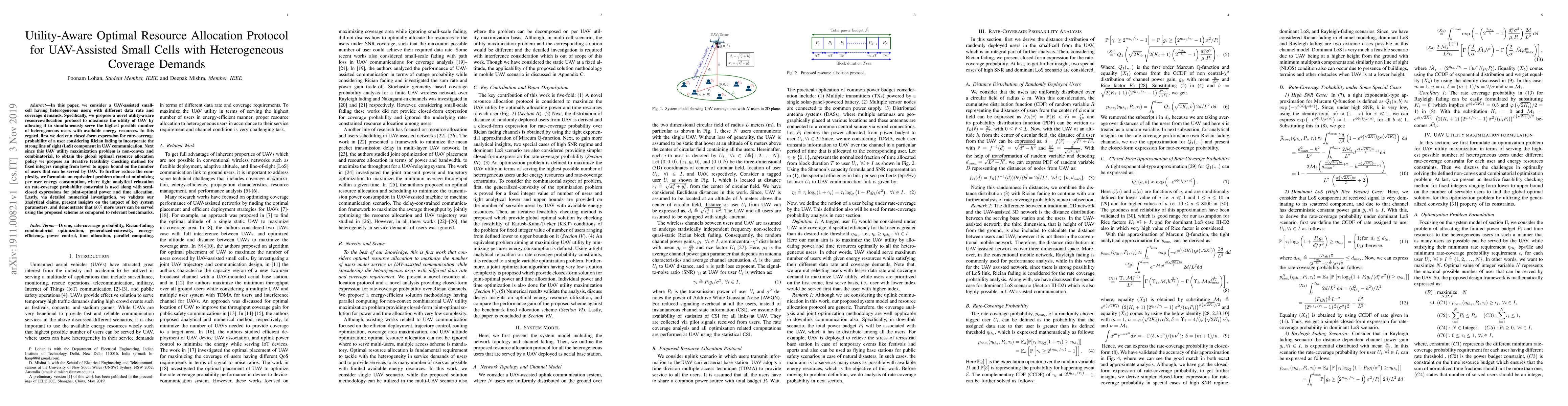In this paper, we consider a UAV-assisted small-cell having heterogeneous users with different data rates and coverage demands. Specifically, we propose a novel utility-aware resource-allocation protocol to maximize the utility of UAV by allowing it to simultaneously serve the highest possible number of heterogeneous users with available energy resources. In this regard, first, we derive a closed-form expression for the rate-coverage probability of a user considering Rician fading to incorporate the strong line of sight (LoS) component in UAV communication. Next, since this UAV utility maximization problem is non-convex and combinatorial, to obtain the global optimal resource allocation policy we propose an iterative feasibility checking method for fixed integers ranging from lower to upper bound on the number of users that can be served by UAV. To further reduce the complexity, we formulate an equivalent problem aimed at minimizing per user energy consumption, where tight analytical relaxation on rate-coverage probability constraint is used along with semi-closed expressions for joint-optimal power and time allocation. Lastly, via detailed numerical investigation, we validate our analytical claims, present insights on the impact of key system parameters, and demonstrate that 60% more users can be served using the proposed scheme, as compared to relevant benchmarks.