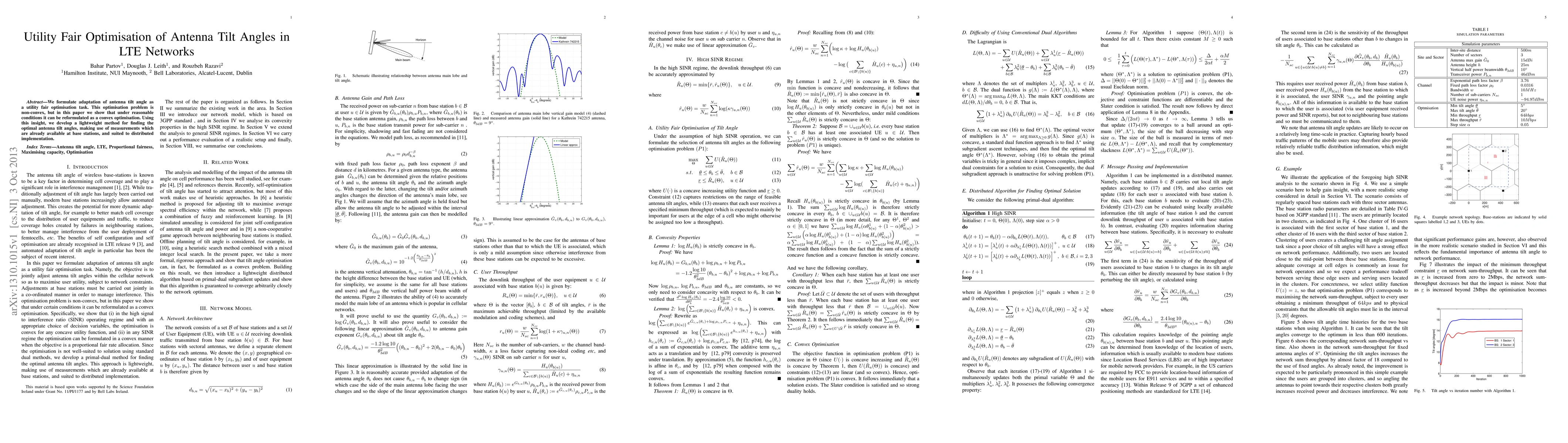 This paper proposes a utility fair optimisation approach to determine optimal antenna tilt angles in LTE networks, reformulating the non-convex problem into a convex one for efficient distributed implementation using existing base station measurements. The developed method aims to achieve fair performance across different users.
