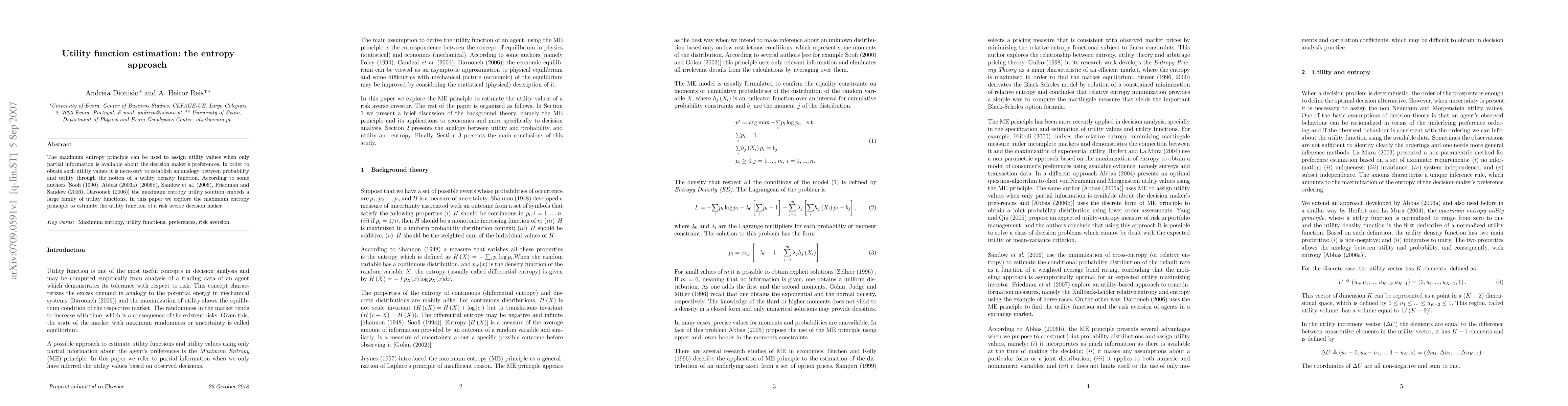 This paper explores the maximum entropy principle to estimate utility values for a risk-averse decision maker when only partial preference information is available. It establishes an analogy between probability and utility via a utility density function, embedding a broad family of utility functions within the maximum entropy approach.