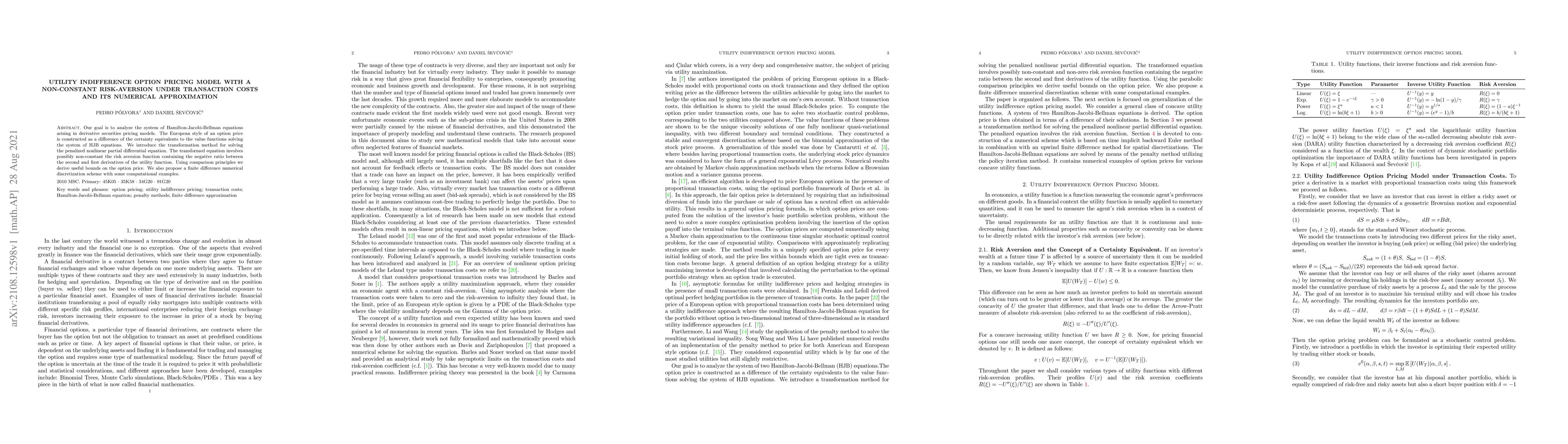 Our goal is to analyze the system of Hamilton-Jacobi-Bellman equations arising in derivative securities pricing models. The European style of an option price is constructed as a difference of the certainty equivalents to the value functions solving the system of HJB equations. We introduce the transformation method for solving the penalized nonlinear partial differential equation. The transformed equation involves possibly non-constant the risk aversion function containing the negative ratio between the second and first derivatives of the utility function. Using comparison principles we derive useful bounds on the option price. We also propose a finite difference numerical discretization scheme with some computational examples.