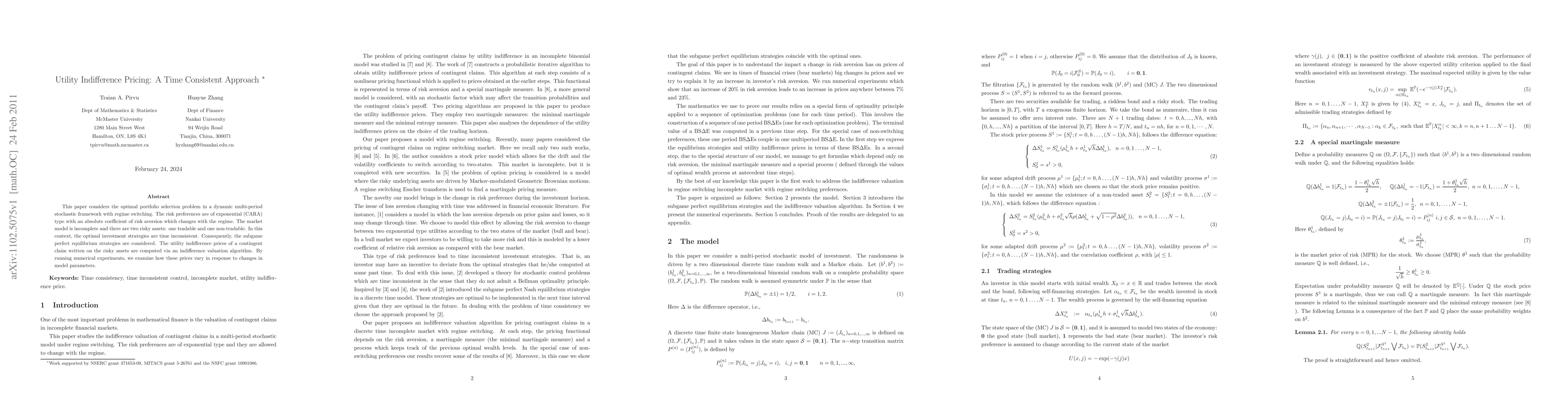This paper considers the optimal portfolio selection problem in a dynamic multi-period stochastic framework with regime switching. The risk preferences are of exponential (CARA) type with an absolute coefficient of risk aversion which changes with the regime. The market model is incomplete and there are two risky assets: one tradable and one non-tradable. In this context, the optimal investment strategies are time inconsistent. Consequently, the subgame perfect equilibrium strategies are considered. The utility indifference prices of a contingent claim written on the risky assets are computed via an indifference valuation algorithm. By running numerical experiments, we examine how these prices vary in response to changes in model parameters.