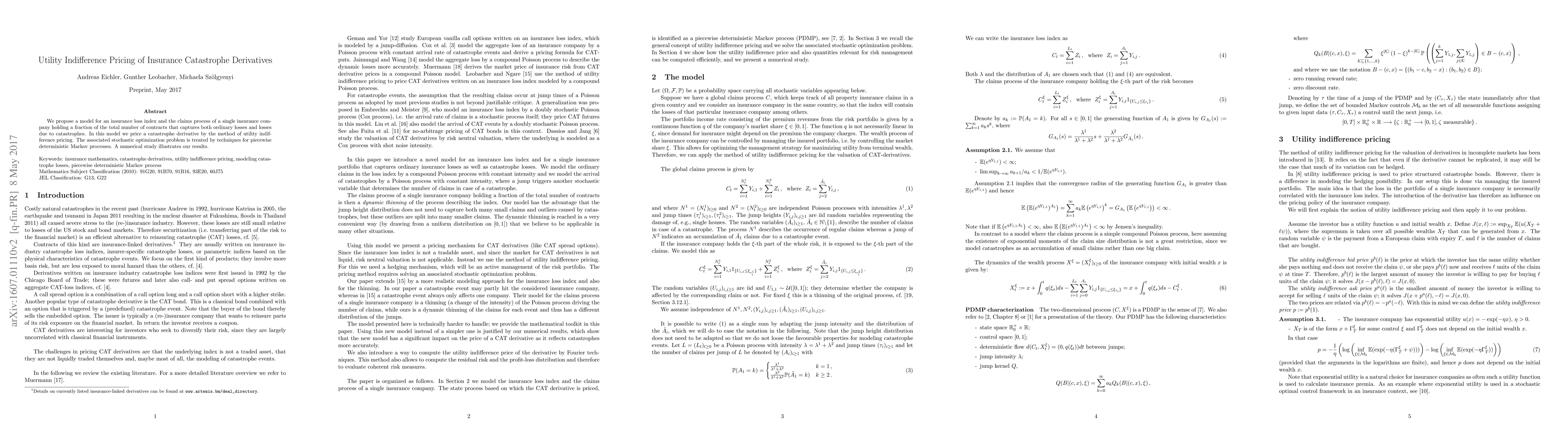 This paper proposes a model for pricing catastrophe derivatives using utility indifference pricing, focusing on an insurance company's claims process that includes both ordinary and catastrophic losses. The stochastic optimization problem is solved using techniques for piecewise deterministic Markov processes, with numerical results demonstrated in a study.