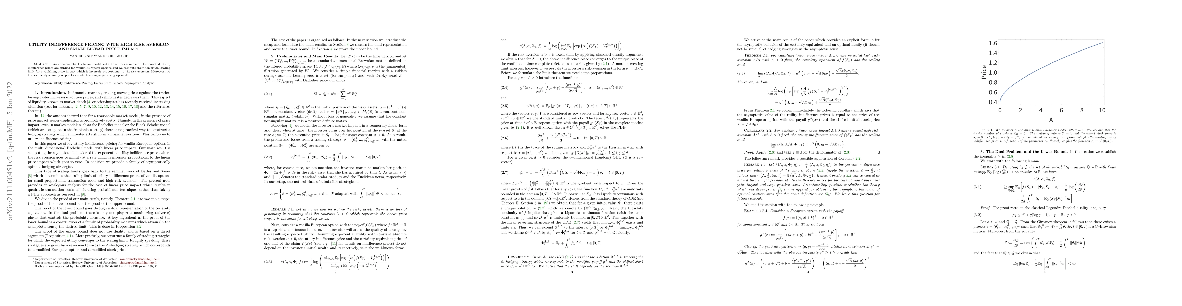 This paper examines the Bachelier model with linear price impact, focusing on exponential utility indifference pricing for European options. It derives the non-trivial scaling limit of these prices as the price impact diminishes, inversely proportional to risk aversion, and identifies a family of asymptotically optimal portfolios.