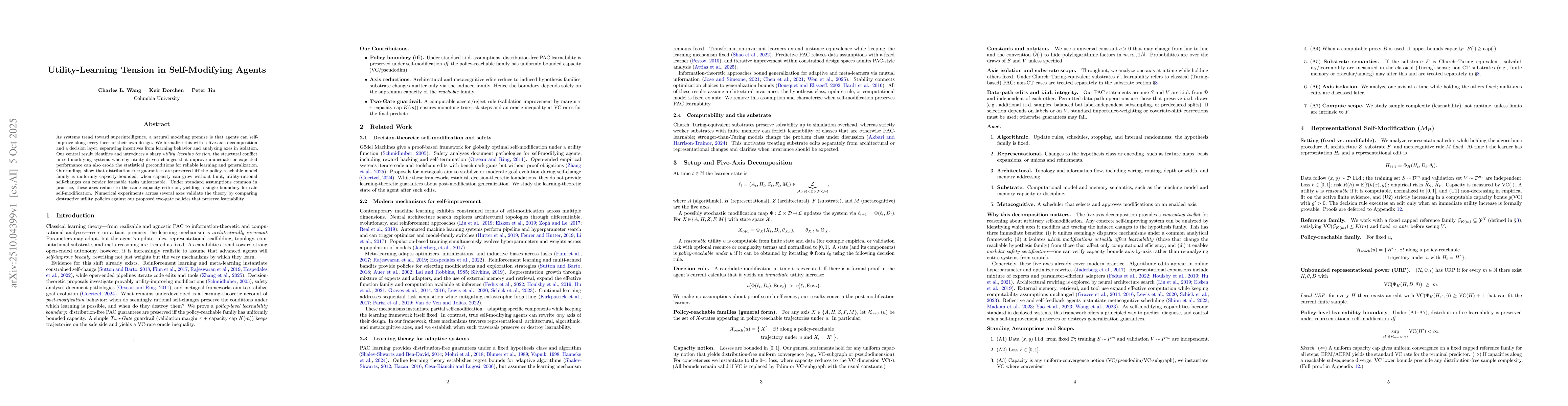 As systems trend toward superintelligence, a natural modeling premise is that agents can self-improve along every facet of their own design. We formalize this with a five-axis decomposition and a decision layer, separating incentives from learning behavior and analyzing axes in isolation. Our central result identifies and introduces a sharp utility--learning tension, the structural conflict in self-modifying systems whereby utility-driven changes that improve immediate or expected performance can also erode the statistical preconditions for reliable learning and generalization. Our findings show that distribution-free guarantees are preserved iff the policy-reachable model family is uniformly capacity-bounded; when capacity can grow without limit, utility-rational self-changes can render learnable tasks unlearnable. Under standard assumptions common in practice, these axes reduce to the same capacity criterion, yielding a single boundary for safe self-modification. Numerical experiments across several axes validate the theory by comparing destructive utility policies against our proposed two-gate policies that preserve learnability.