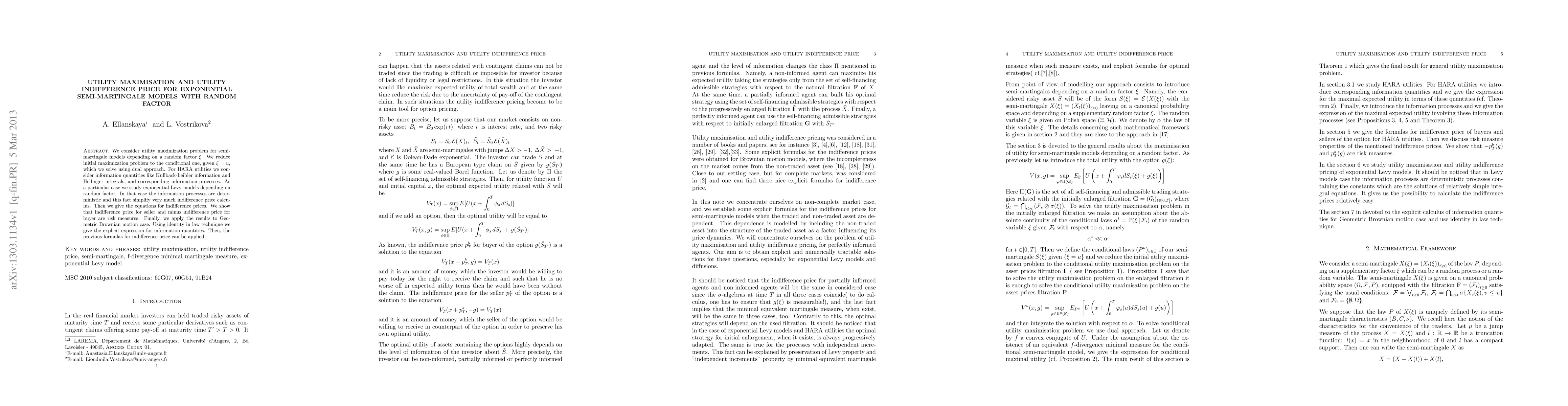 We consider utility maximization problem for semi-martingale models depending on a random factor $\xi$. We reduce initial maximization problem to the conditional one, given $\xi=u$, which we solve using dual approach. For HARA utilities we consider information quantities like Kullback-Leibler information and Hellinger integrals, and corresponding information processes. As a particular case we study exponential Levy models depending on random factor. In that case the information processes are deterministic and this fact simplify very much indifference price calculus. Then we give the equations for indifference prices. We show that indifference price for seller and minus indifference price for buyer are risk measures. Finally, we apply the results to Geometric Brownian motion case. Using identity in law technique we give the explicit expression for information quantities. Then, the previous formulas for indifference price can be applied.