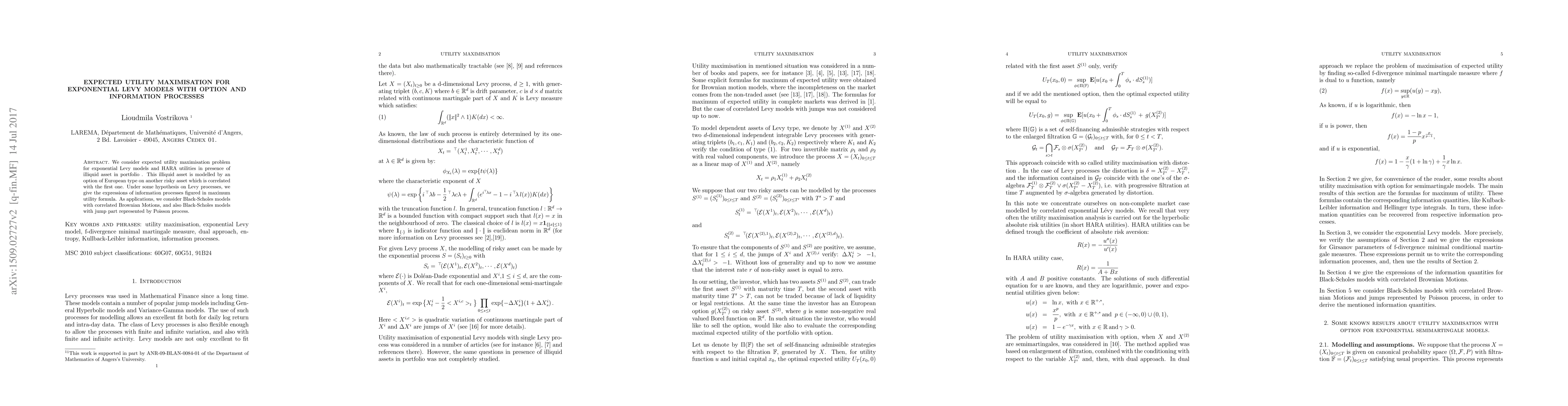 This paper explores utility maximization in exponential Lévy models for HARA utilities, focusing on portfolios containing an illiquid asset modeled as a European option on another risky asset. It derives expressions for information processes under certain assumptions and applies the results to Black-Scholes models with correlated Brownian motions and jump processes.