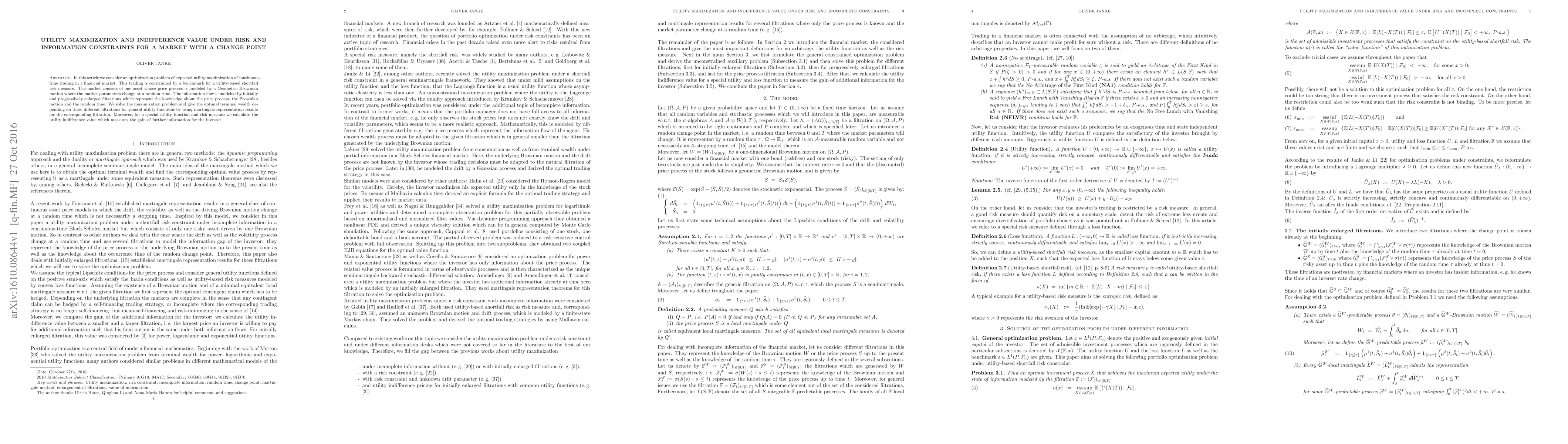 This paper optimizes expected utility in a financial market with changing parameters and risk constraints, modeling asset prices via Geometric Brownian motion. It determines the optimal terminal wealth under different information filtrations and computes the utility indifference value for additional information, highlighting its impact on investor decisions.