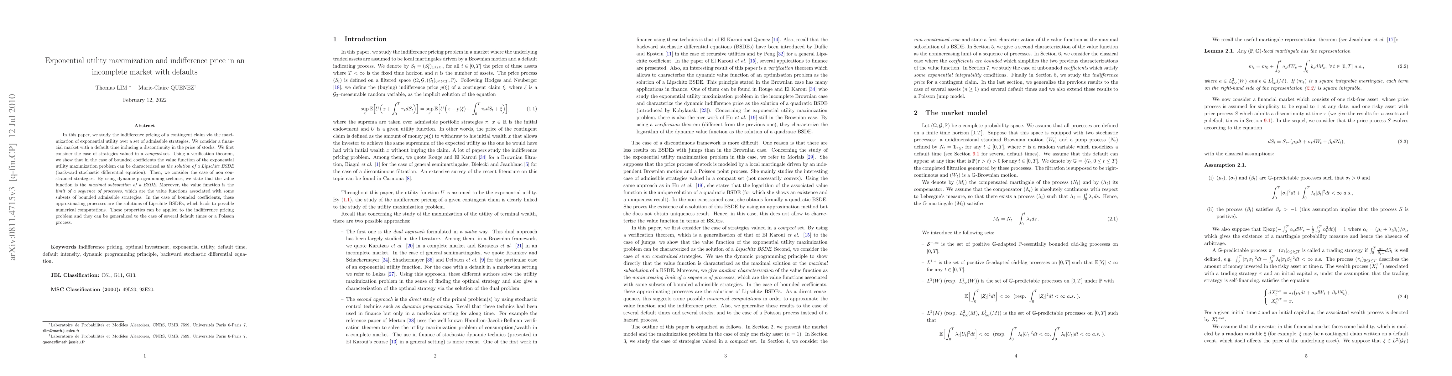 This paper investigates the expected utility maximization problem in incomplete markets with default risk. It employs dynamic programming and backward stochastic differential equations to characterize the value function and derive optimal portfolio policies for exponential, power, and logarithmic utility functions.
