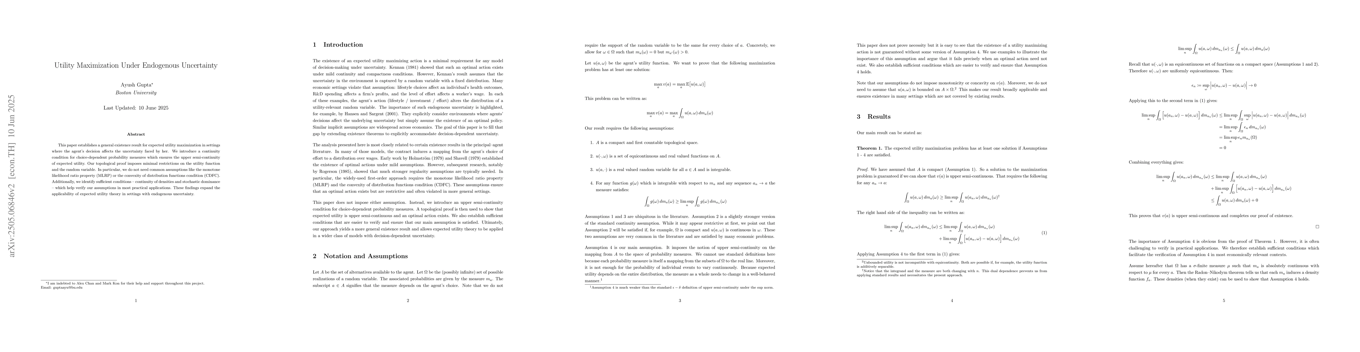 This paper establishes a general existence result for optimal decision-making when choices affect the probabilities of uncertain outcomes. We introduce a continuity condition - a version of upper semi-continuity for choice-dependent probability measures - which ensures upper semi-continuity of expected utility. Our topological proof does not require standard assumptions such as concavity of preferences or monotonicity of outcome distributions. Additionally, we identify sufficient conditions, including continuity of densities and stochastic dominance, which allow the main assumption to be verified in relevant economic contexts. These findings expand the applicability of expected utility theory in settings with endogenous uncertainty.