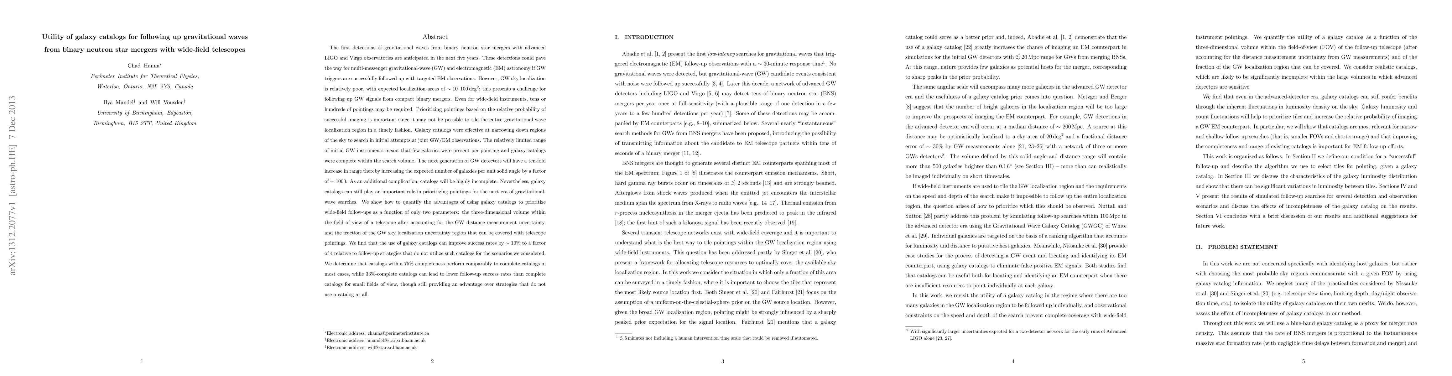 This paper explores the utility of galaxy catalogs for follow-up observations of gravitational waves from binary neutron star mergers, demonstrating that they can improve follow-up success rates by 10% to a factor of 4. The study finds that even incomplete catalogs can significantly enhance follow-up strategies compared to non-catalog approaches.