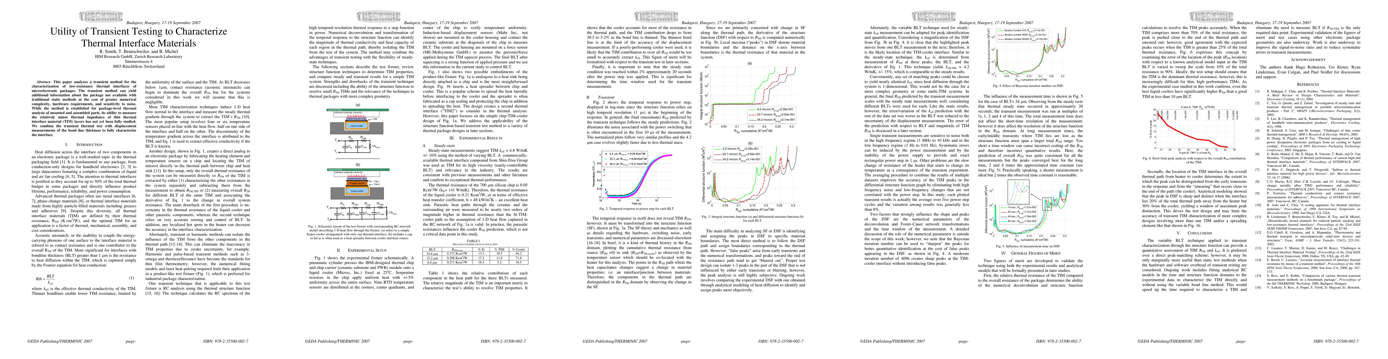 This research introduces a transient method for characterizing thermal interface materials in microelectronic packages, providing detailed information not available through traditional methods. It combines transient thermal testing with bond line thickness displacement measurements for comprehensive interface characterization.