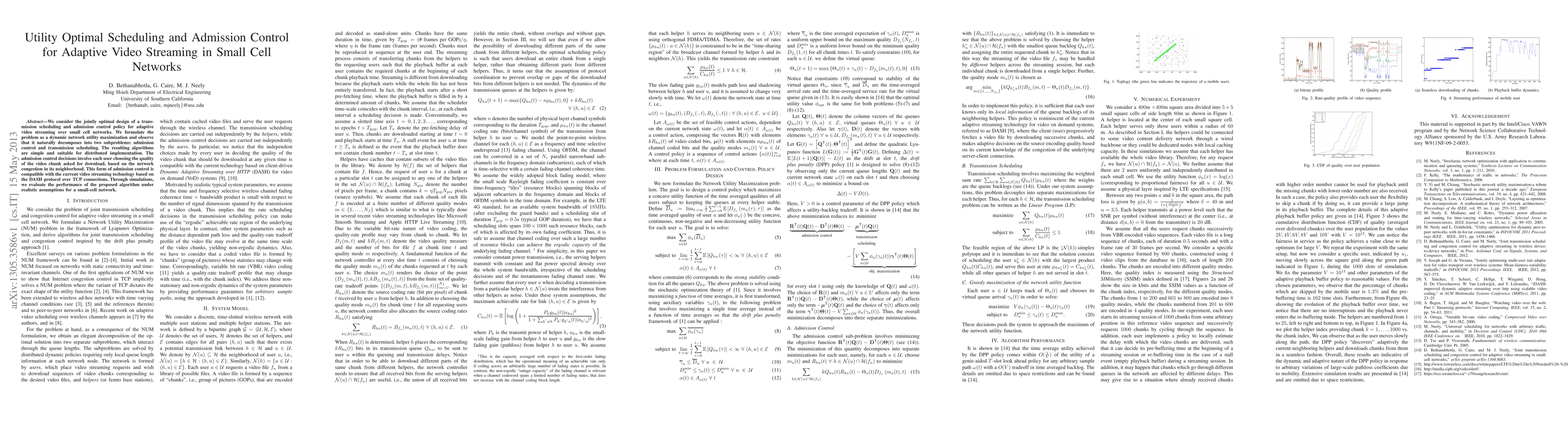 This paper proposes an optimal scheduling and admission control algorithm for adaptive video streaming in small cell networks, formulated as a dynamic network utility maximization problem. The algorithm decomposes into admission control and transmission scheduling, enabling distributed implementation and compatibility with current DASH-based streaming technology. Simulation results demonstrate its performance under realistic network conditions.