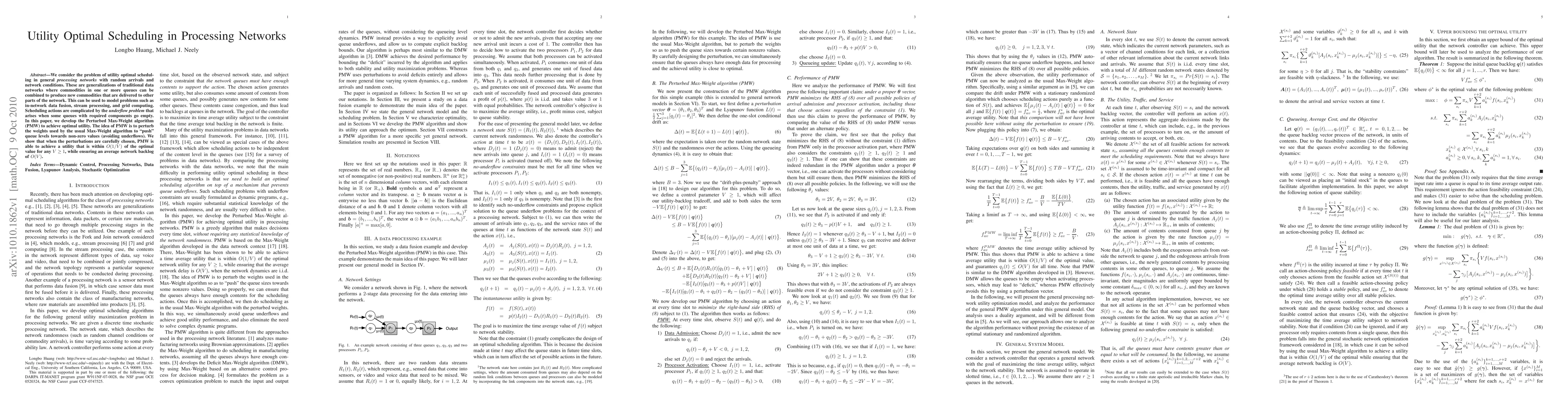 We consider the problem of utility optimal scheduling in general \emph{processing networks} with random arrivals and network conditions. These are generalizations of traditional data networks where commodities in one or more queues can be combined to produce new commodities that are delivered to other parts of the network. This can be used to model problems such as in-network data fusion, stream processing, and grid computing. Scheduling actions are complicated by the \emph{underflow problem} that arises when some queues with required components go empty. In this paper, we develop the Perturbed Max-Weight algorithm (PMW) to achieve optimal utility. The idea of PMW is to perturb the weights used by the usual Max-Weight algorithm to ``push'' queue levels towards non-zero values (avoiding underflows). We show that when the perturbations are carefully chosen, PMW is able to achieve a utility that is within $O(1/V)$ of the optimal value for any $V\geq1$, while ensuring an average network backlog of $O(V)$.