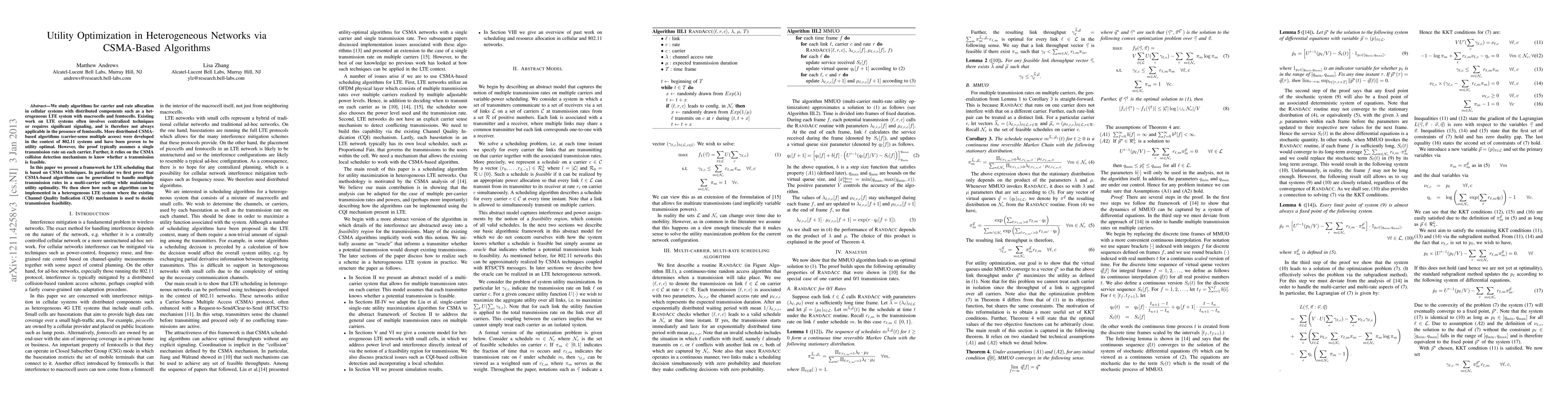 This paper develops distributed CSMA-based algorithms for carrier and rate allocation in heterogeneous LTE networks, proving utility optimality for multi-carrier systems with multiple transmission rates. It implements these algorithms using existing Channel Quality Indication mechanisms to determine transmission feasibility.