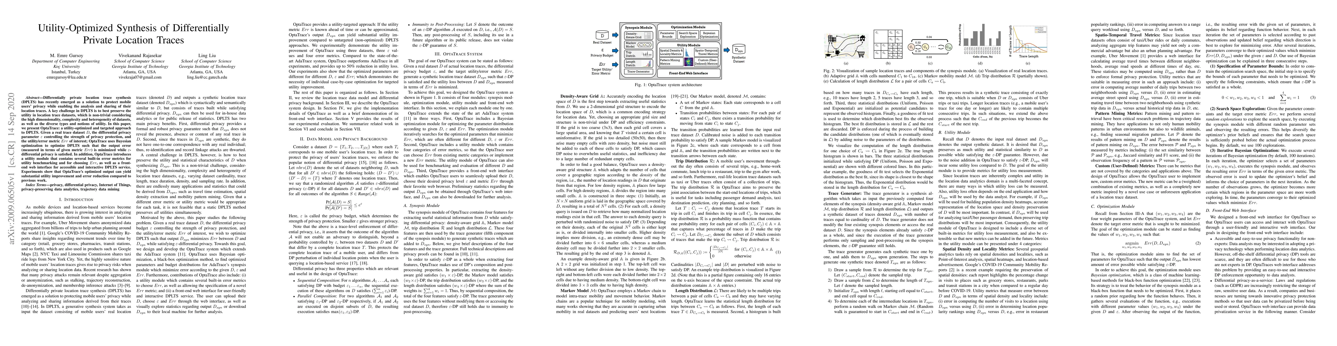 This paper introduces OptaTrace, a utility-optimized method for differentially private location trace synthesis (DPLTS) that uses Bayesian optimization to minimize output error while maintaining privacy, and includes a utility module and web interface for benchmarking and interactive service. Experiments demonstrate significant utility improvement and error reduction compared to prior approaches.