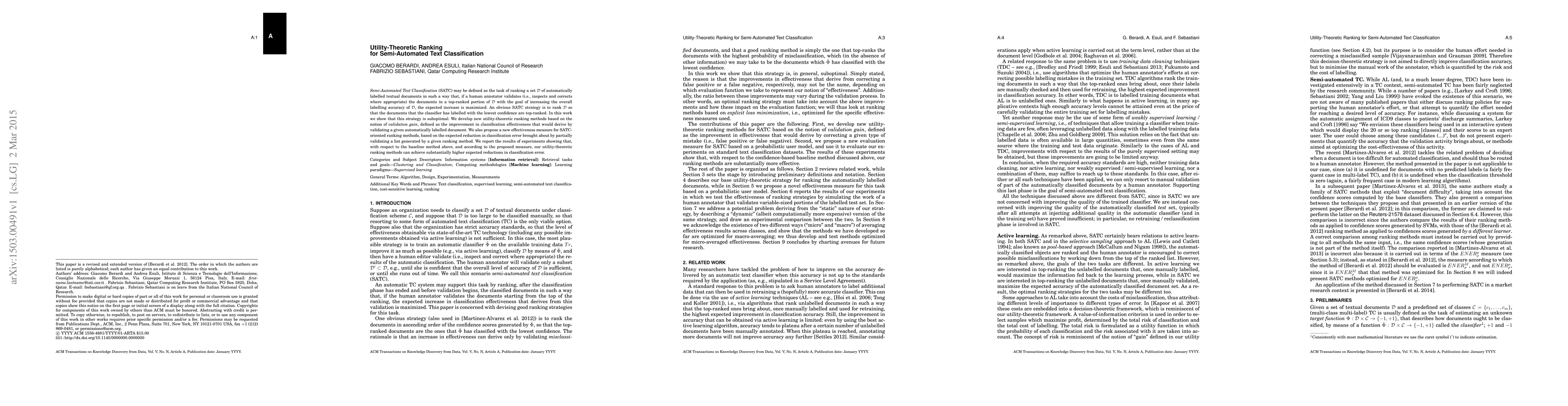 This paper proposes utility-theoretic ranking methods for semi-automated text classification, showing that ranking documents by the classifier's confidence is suboptimal. The authors introduce a new measure based on validation gain and demonstrate that their methods achieve significantly higher reductions in classification error compared to the baseline.