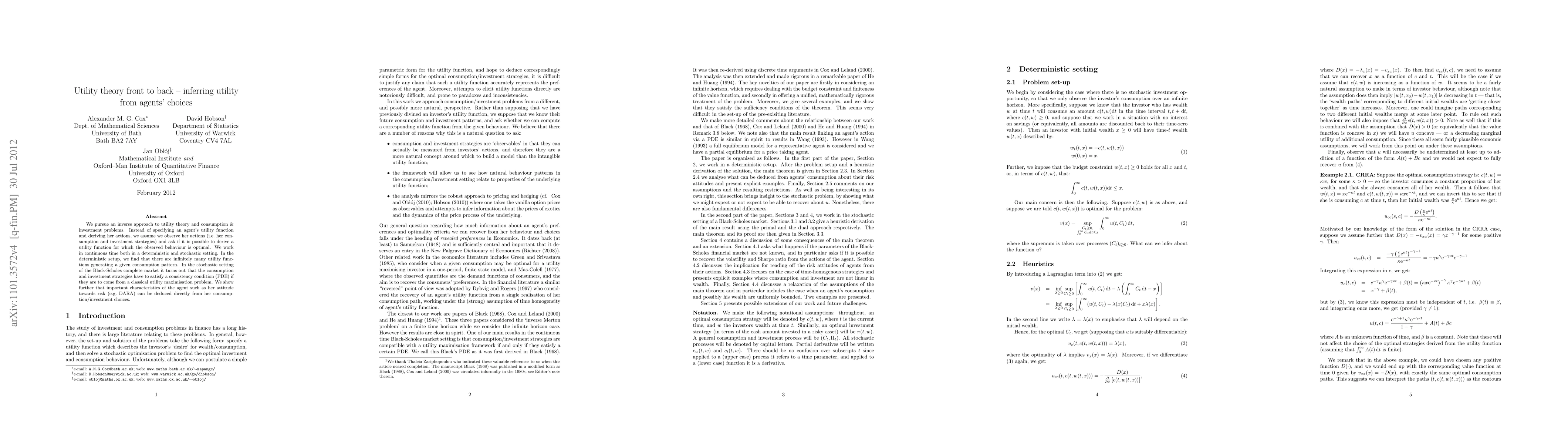 We pursue an inverse approach to utility theory and consumption & investment problems. Instead of specifying an agent's utility function and deriving her actions, we assume we observe her actions (i.e. her consumption and investment strategies) and ask if it is possible to derive a utility function for which the observed behaviour is optimal. We work in continuous time both in a deterministic and stochastic setting. In the deterministic setup, we find that there are infinitely many utility functions generating a given consumption pattern. In the stochastic setting of the Black-Scholes complete market it turns out that the consumption and investment strategies have to satisfy a consistency condition (PDE) if they are to come from a classical utility maximisation problem. We show further that important characteristics of the agent such as her attitude towards risk (e.g. DARA) can be deduced directly from her consumption/investment choices.
