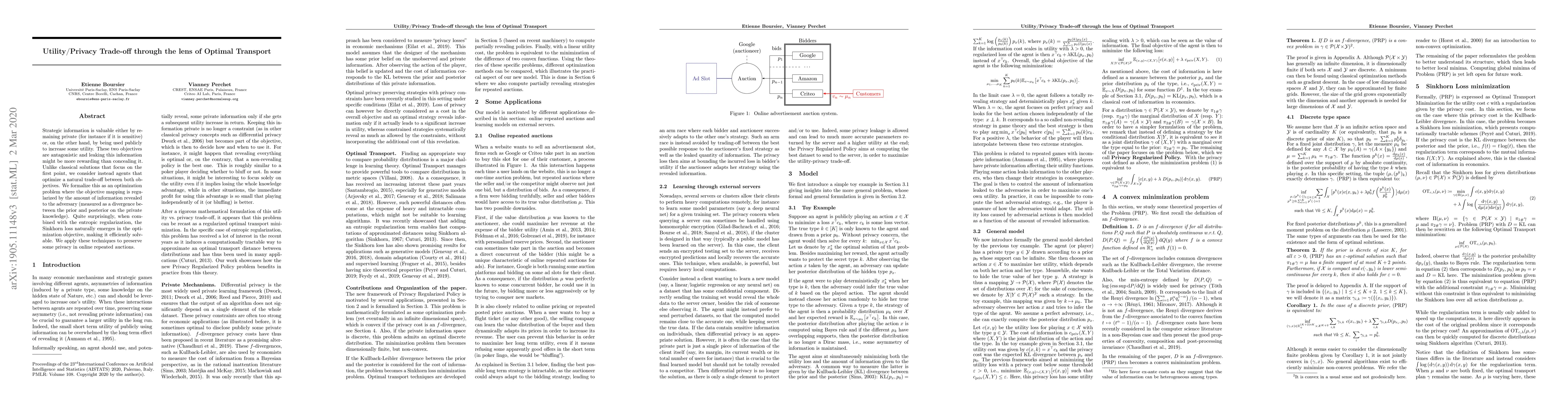 Researchers propose a novel method to balance utility and privacy in online auctions by optimizing an information trade-off using Optimal Transport, achieving efficient solvability with the Sinkhorn loss.