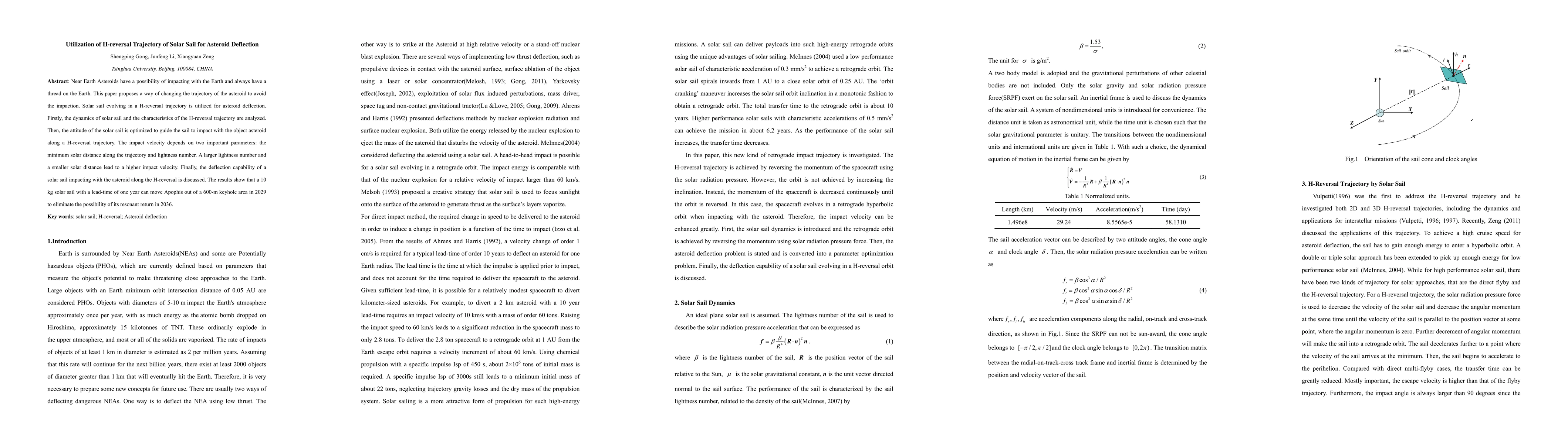 This paper proposes using a solar sail on an H-reversal trajectory to deflect near-Earth asteroids, analyzing its dynamics and optimizing its attitude for effective impact. The study concludes that a 10 kg solar sail with a one-year lead time can successfully move Apophis out of a critical trajectory zone.
