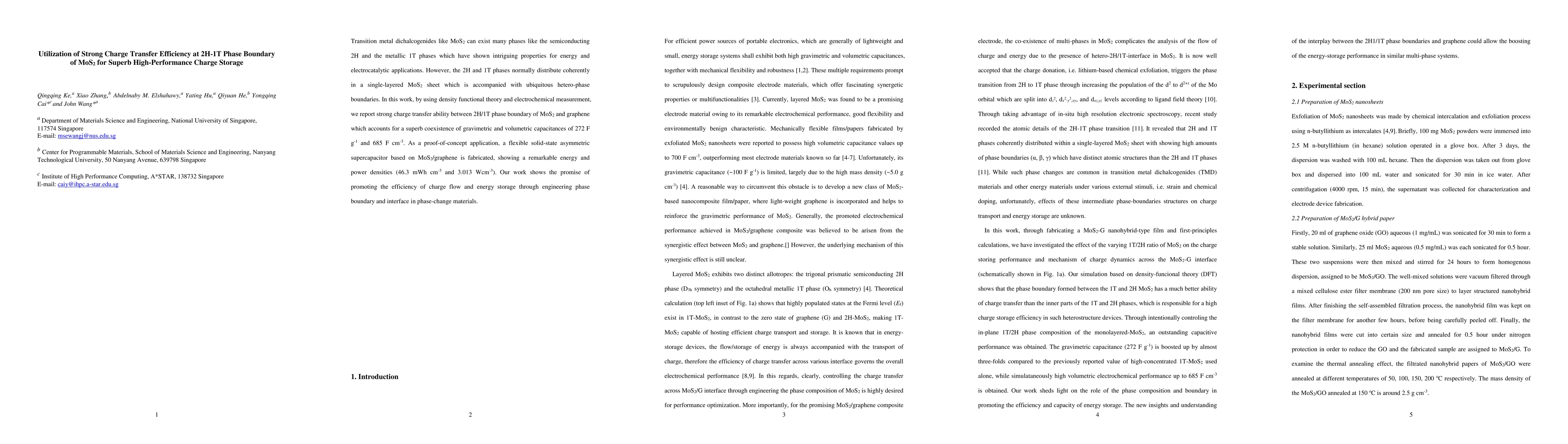 Transition metal dichalcogenides like MoS2 can exist many phases like the semiconducting 2H and the metallic 1T phases which have shown intriguing properties for energy and electrocatalytic applications. However, the 2H and 1T phases normally distribute coherently in a single-layered MoS2 sheet which is accompanied with ubiquitous hetero-phase boundaries. In this work, by using density functional theory and electrochemical measurement, we report strong charge transfer ability between 2H/1T phase boundary of MoS2 and graphene which accounts for a superb coexistence of gravimetric and volumetric capacitances of 272 F g-1 and 685 F cm-3. As a proof-of-concept application, a flexible solid-state asymmetric supercapacitor based on MoS2/graphene is fabricated, showing a remarkable energy and power densities (46.3 mWh cm-3 and 3.013 Wcm-3). Our work shows the promise of promoting the efficiency of charge flow and energy storage through engineering phase boundary and interface in phase-change materials.