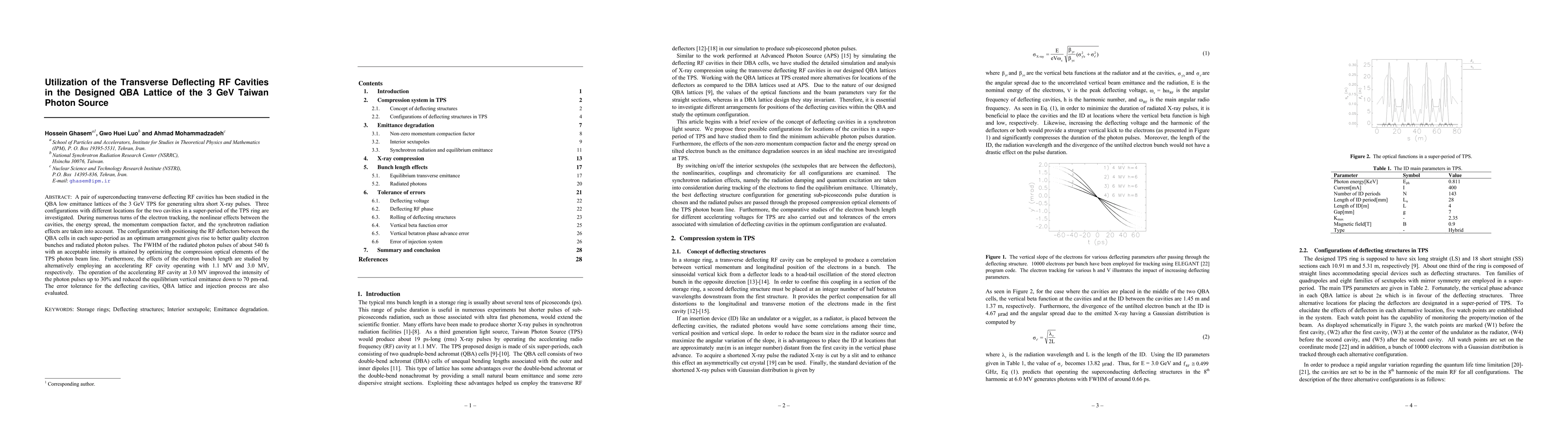 A pair of superconducting transverse deflecting RF cavities has been studied in the QBA low emittance lattices of the 3 GeV TPS for generating ultra short X-ray pulses. Three configurations with different locations for the two cavities in a super-period of the TPS ring are investigated. During numerous turns of the electron tracking, the nonlinear effects between the cavities, the energy spread, the momentum compaction factor, and the synchrotron radiation effects are taken into account. The configuration with positioning the RF deflectors between the QBA cells in each super-period as an optimum arrangement gives rise to better quality electron bunches and radiated photon pulses. The FWHM of the radiated photon pulses of about 540 fs with an acceptable intensity is attained by optimizing the compression optical elements of the TPS photon beam line. Furthermore, the effects of the electron bunch length are studied by alternatively employing an accelerating RF cavity operating with 1.1 MV and 3.0 MV, respectively. The operation of the accelerating RF cavity at 3.0 MV improved the intensity of the photon pulses up to 30% and reduced the equilibrium vertical emittance down to 70 pm-rad. The error tolerance for the deflecting cavities, QBA lattice and injection process are also evaluated.