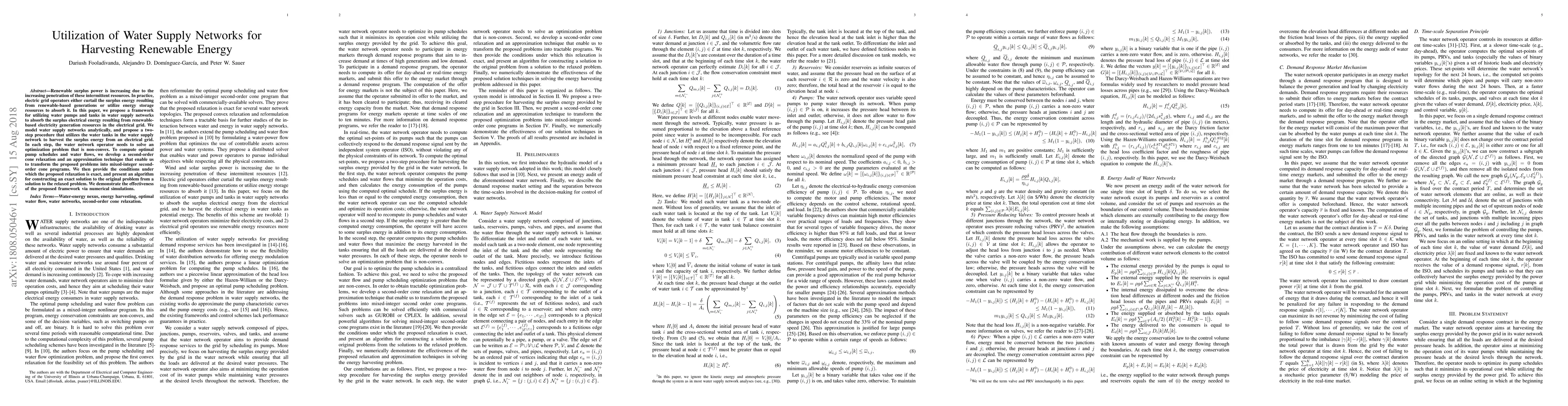 This paper proposes a framework to utilize water supply networks to absorb surplus renewable energy by optimizing water pump schedules and flows. The authors develop a two-step optimization procedure and a mixed-integer second-order cone program to solve non-convex problems, demonstrating the framework's effectiveness through numerical simulations.