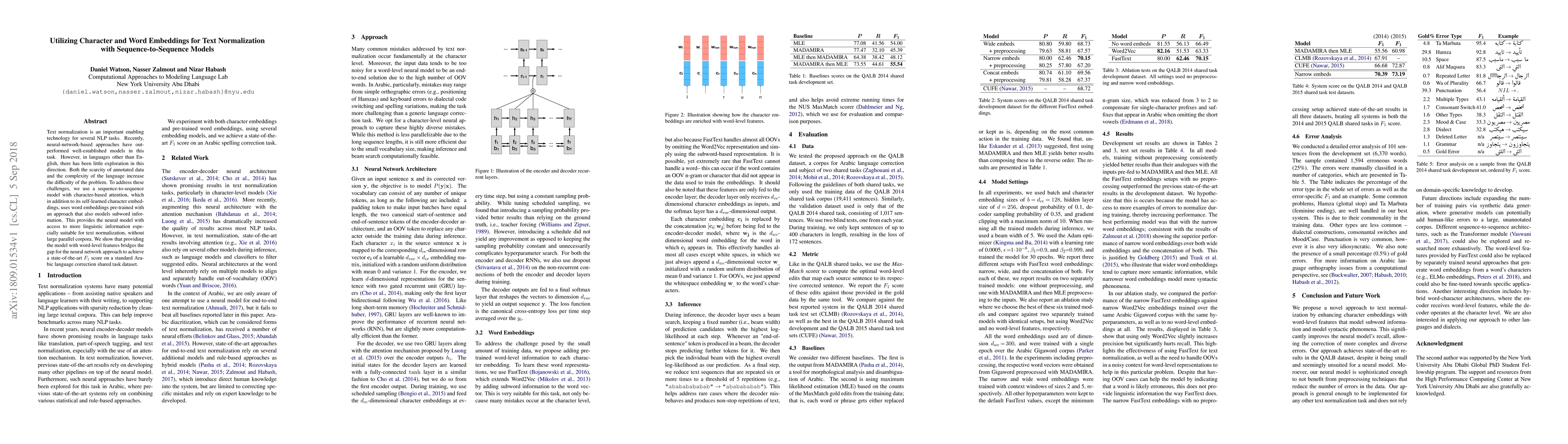 This paper proposes a sequence-to-sequence model for text normalization that combines character embeddings with word embeddings pre-trained to model subword information, achieving state-of-the-art results on an Arabic text correction task despite limited annotated data.