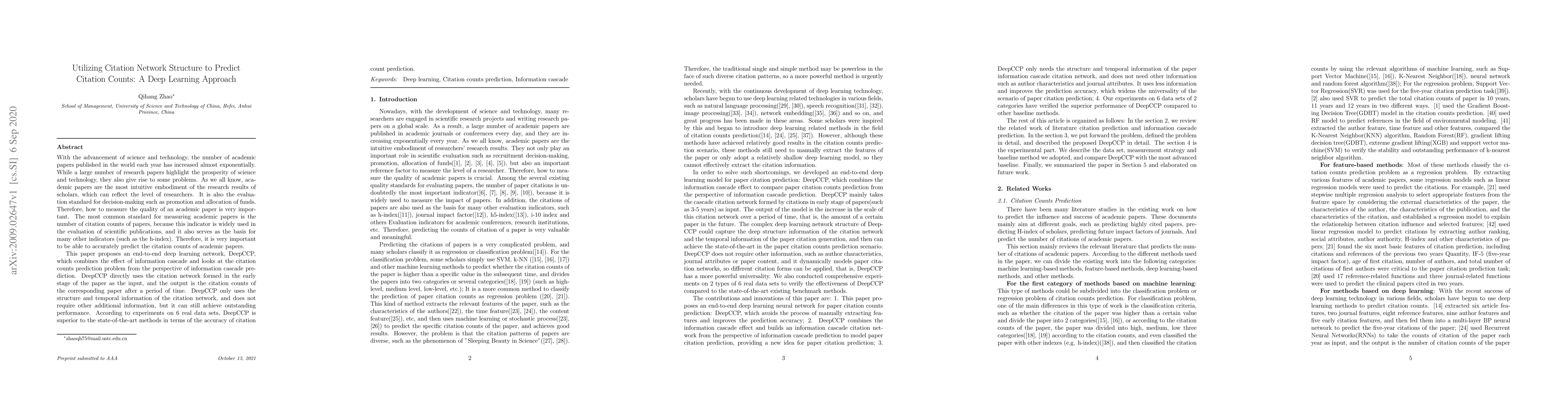 This paper introduces DeepCCP, a deep learning network that predicts academic paper citation counts using the citation network structure and temporal information. Experiments show that DeepCCP outperforms existing methods in citation count prediction accuracy.