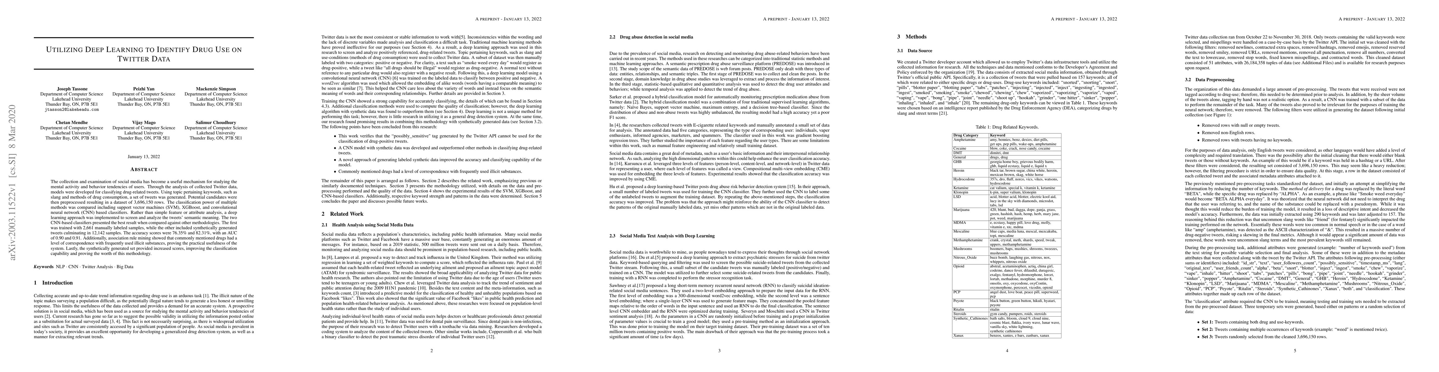 The collection and examination of social media has become a useful mechanism for studying the mental activity and behavior tendencies of users. Through the analysis of collected Twitter data, models were developed for classifying drug-related tweets. Using topic pertaining keywords, such as slang and methods of drug consumption, a set of tweets was generated. Potential candidates were then preprocessed resulting in a dataset of 3,696,150 rows. The classification power of multiple methods was compared including support vector machines (SVM), XGBoost, and convolutional neural network (CNN) based classifiers. Rather than simple feature or attribute analysis, a deep learning approach was implemented to screen and analyze the tweets' semantic meaning. The two CNN-based classifiers presented the best result when compared against other methodologies. The first was trained with 2,661 manually labeled samples, while the other included synthetically generated tweets culminating in 12,142 samples. The accuracy scores were 76.35% and 82.31%, with an AUC of 0.90 and 0.91. Additionally, association rule mining showed that commonly mentioned drugs had a level of correspondence with frequently used illicit substances, proving the practical usefulness of the system. Lastly, the synthetically generated set provided increased scores, improving the classification capability and proving the worth of this methodology.