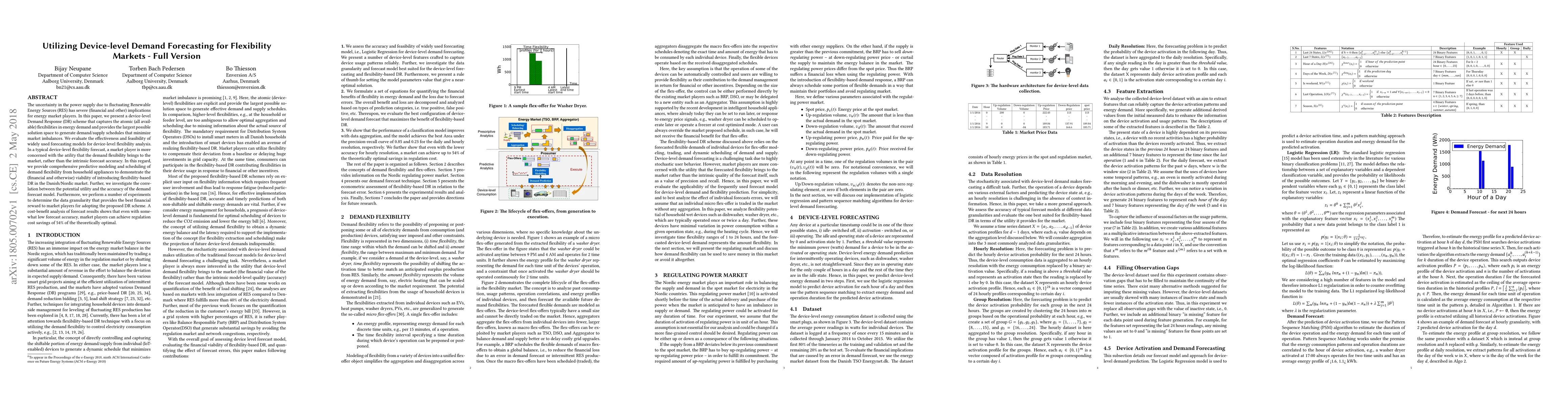 The uncertainty in the power supply due to fluctuating Renewable Energy Sources (RES) has severe (financial and other) implications for energy market players. In this paper, we present a device-level Demand Response (DR) scheme that captures the atomic (all available) flexibilities in energy demand and provides the largest possible solution space to generate demand/supply schedules that minimize market imbalances. We evaluate the effectiveness and feasibility of widely used forecasting models for device-level flexibility analysis. In a typical device-level flexibility forecast, a market player is more concerned with the \textit{utility} that the demand flexibility brings to the market, rather than the intrinsic forecast accuracy. In this regard, we provide comprehensive predictive modeling and scheduling of demand flexibility from household appliances to demonstrate the (financial and otherwise) viability of introducing flexibility-based DR in the Danish/Nordic market. Further, we investigate the correlation between the potential utility and the accuracy of the demand forecast model. Furthermore, we perform a number of experiments to determine the data granularity that provides the best financial reward to market players for adopting the proposed DR scheme. A cost-benefit analysis of forecast results shows that even with somewhat low forecast accuracy, market players can achieve regulation cost savings of 54% of the theoretically optimal.