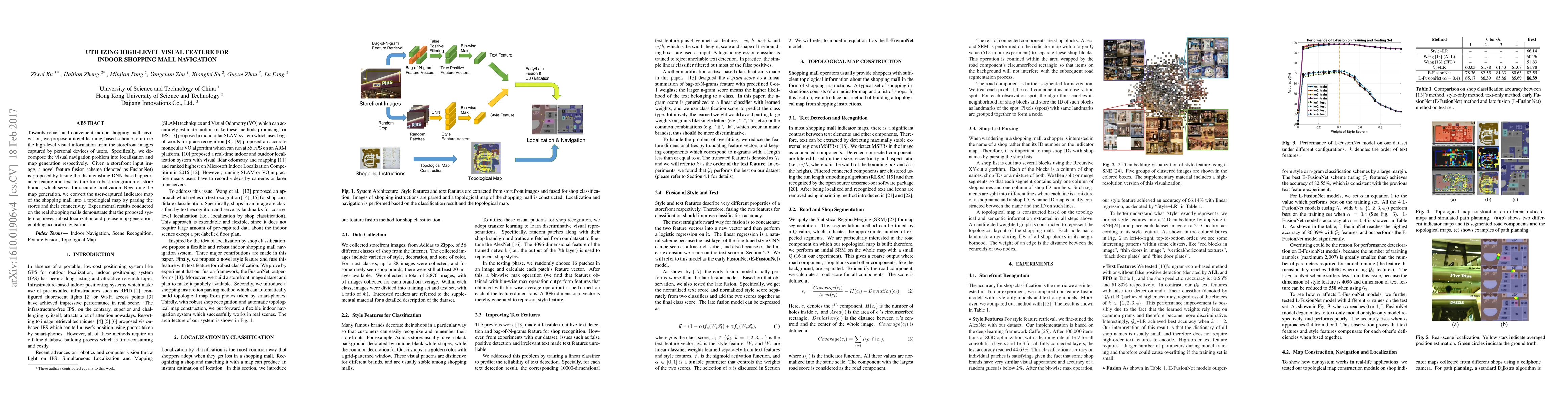 Towards robust and convenient indoor shopping mall navigation, we propose a novel learning-based scheme to utilize the high-level visual information from the storefront images captured by personal devices of users. Specifically, we decompose the visual navigation problem into localization and map generation respectively. Given a storefront input image, a novel feature fusion scheme (denoted as FusionNet) is proposed by fusing the distinguishing DNN-based appearance feature and text feature for robust recognition of store brands, which serves for accurate localization. Regarding the map generation, we convert the user-captured indicator map of the shopping mall into a topological map by parsing the stores and their connectivity. Experimental results conducted on the real shopping malls demonstrate that the proposed system achieves robust localization and precise map generation, enabling accurate navigation.