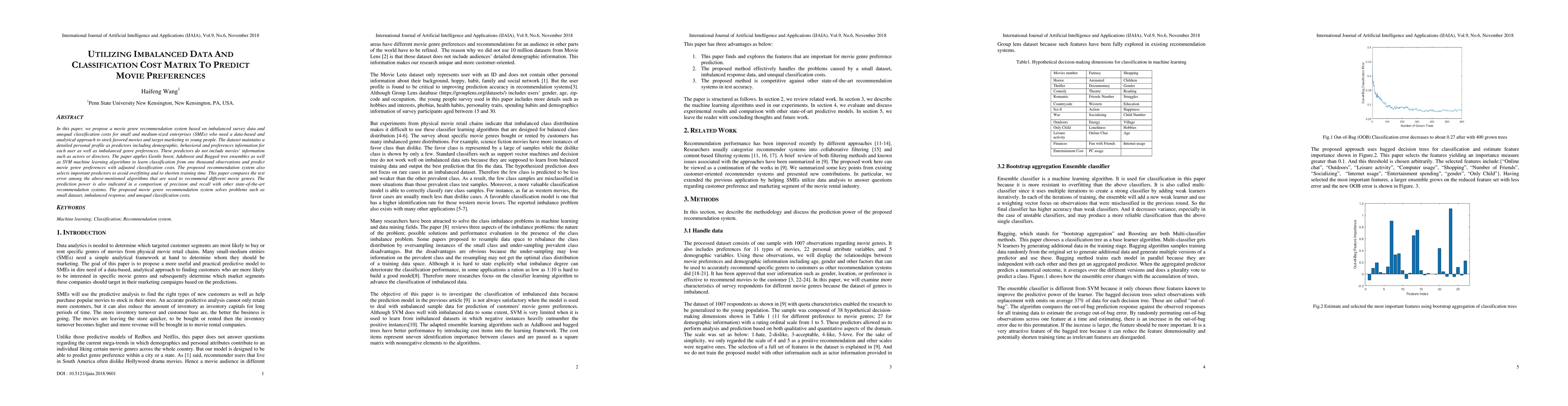 This paper develops a movie genre recommendation system using ensemble and SVM algorithms to predict preferences from imbalanced data, focusing on SMEs' marketing strategies. It evaluates the performance of various machine learning methods and highlights the importance of selecting key predictors to enhance prediction accuracy and efficiency.