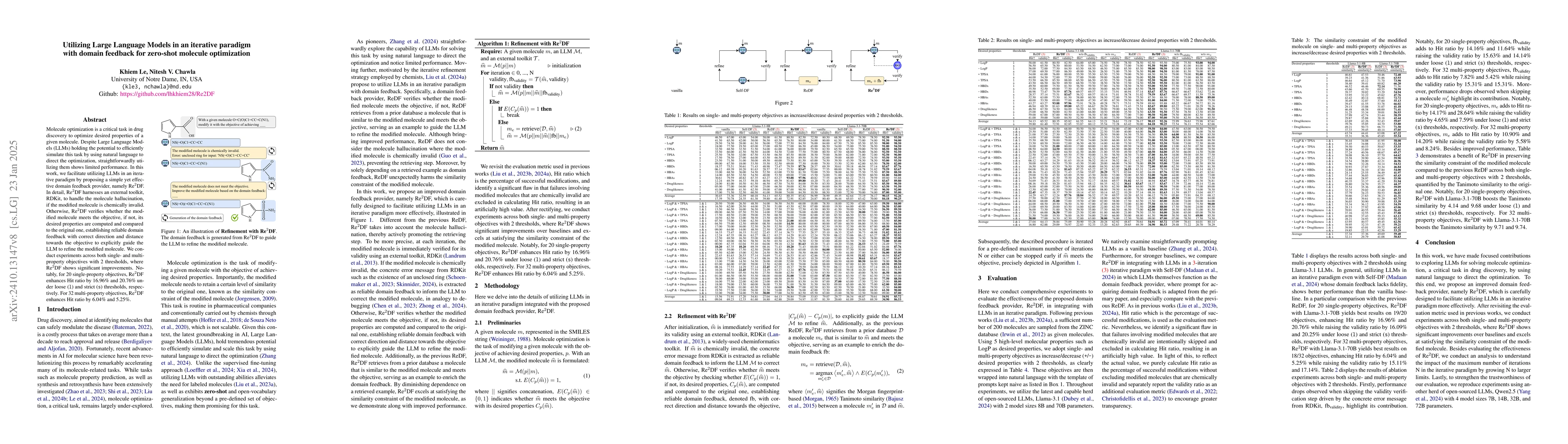 This paper explores the use of Large Language Models (LLMs) in an iterative optimization framework for molecule enhancement in drug discovery, utilizing $\text{Re}^2$DF to provide domain feedback. Experiments show $\text{Re}^2$DF significantly improves Hit ratios for both single- and multi-property objectives.