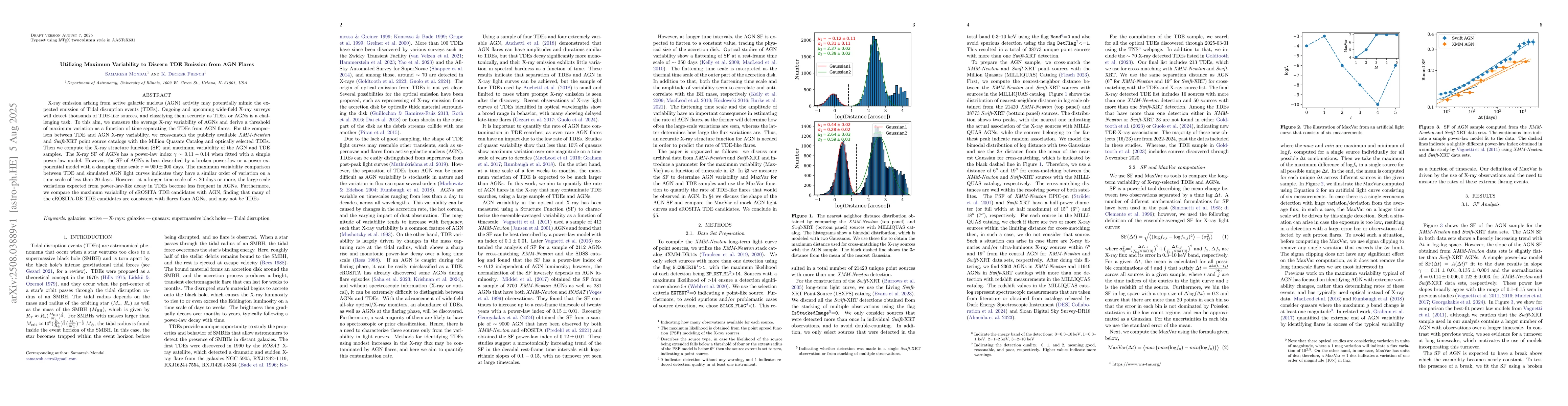X-ray emission arising from active galactic nucleus (AGN) activity may potentially mimic the expected emission of Tidal disruption events (TDEs). Ongoing and upcoming wide-field X-ray surveys will detect thousands of TDE-like sources, and classifying them securely as TDEs or AGNs is a challenging task. To this aim, we measure the average X-ray variability of AGNs and derive a threshold of maximum variation as a function of time separating the TDEs from AGN flares. For the comparison between TDE and AGN X-ray variability, we cross-match the publicly available XMM-Newton and Swift-XRT point source catalogs with the Million Quasars Catalog and optically selected TDEs. Then we compute the X-ray structure function (SF) and maximum variability of the AGN and TDE samples. The X-ray SF of AGNs has a power-law index $\gamma\sim0.11-0.14$ when fitted with a simple power-law model. However, the SF of AGNs is best described by a broken power-law or a power exponential model with a damping time scale $\tau=950\pm300$ days. The maximum variability comparison between TDE and simulated AGN light curves indicates they have a similar order of variation on a time scale of less than 20 days. However, at a longer time scale of ~20 days or more, the large-scale variations expected from power-law-like decay in TDEs become less frequent in AGNs. Furthermore, we compare the maximum variability of eROSITA TDE candidates with AGN, finding that many of the eROSITA-DE TDE candidates are consistent with flares from AGNs, and may not be TDEs.