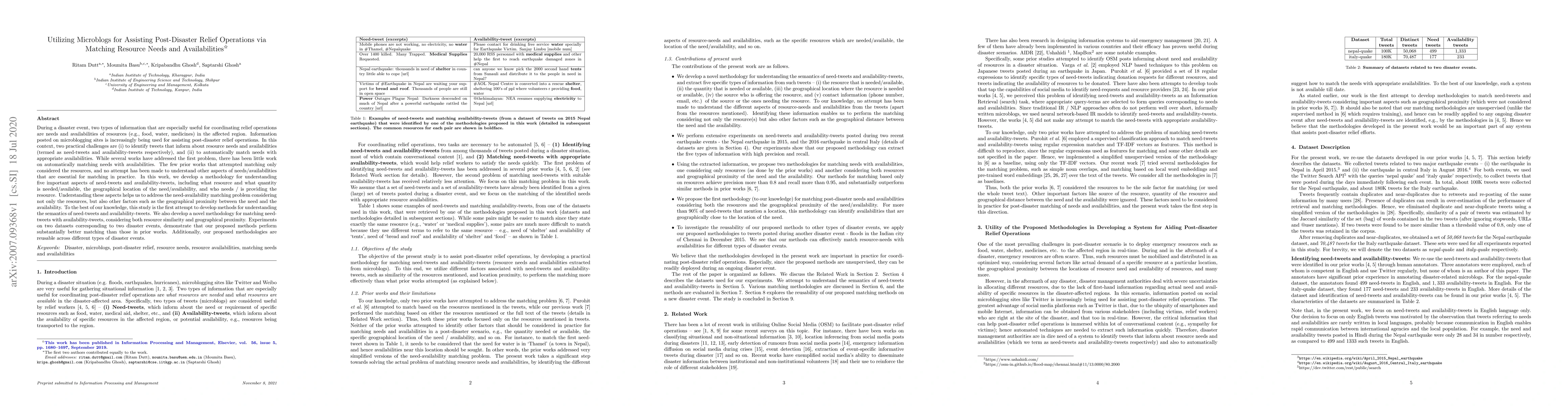 During a disaster event, two types of information that are especially useful for coordinating relief operations are needs and availabilities of resources (e.g., food, water, medicines) in the affected region. Information posted on microblogging sites is increasingly being used for assisting post-disaster relief operations. In this context, two practical challenges are (i)~to identify tweets that inform about resource needs and availabilities (termed as need-tweets and availability-tweets respectively), and (ii)~to automatically match needs with appropriate availabilities. While several works have addressed the first problem, there has been little work on automatically matching needs with availabilities. The few prior works that attempted matching only considered the resources, and no attempt has been made to understand other aspects of needs/availabilities that are essential for matching in practice. In this work, we develop a methodology for understanding five important aspects of need-tweets and availability-tweets, including what resource and what quantity is needed/available, the geographical location of the need/availability, and who needs / is providing the resource. Understanding these aspects helps us to address the need-availability matching problem considering not only the resources, but also other factors such as the geographical proximity between the need and the availability. To our knowledge, this study is the first attempt to develop methods for understanding the semantics of need-tweets and availability-tweets. We also develop a novel methodology for matching need-tweets with availability-tweets, considering both resource similarity and geographical proximity. Experiments on two datasets corresponding to two disaster events, demonstrate that our proposed methods perform substantially better matching than those in prior works.