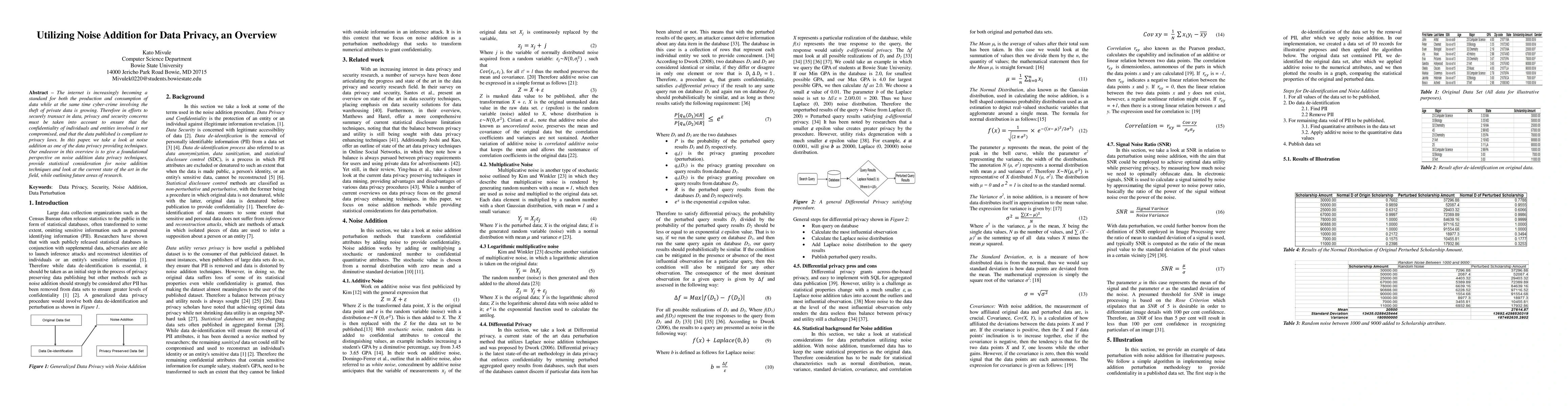 The internet is increasingly becoming a standard for both the production and consumption of data while at the same time cyber-crime involving the theft of private data is growing. Therefore in efforts to securely transact in data, privacy and security concerns must be taken into account to ensure that the confidentiality of individuals and entities involved is not compromised, and that the data published is compliant to privacy laws. In this paper, we take a look at noise addition as one of the data privacy providing techniques. Our endeavor in this overview is to give a foundational perspective on noise addition data privacy techniques, provide statistical consideration for noise addition techniques and look at the current state of the art in the field, while outlining future areas of research.