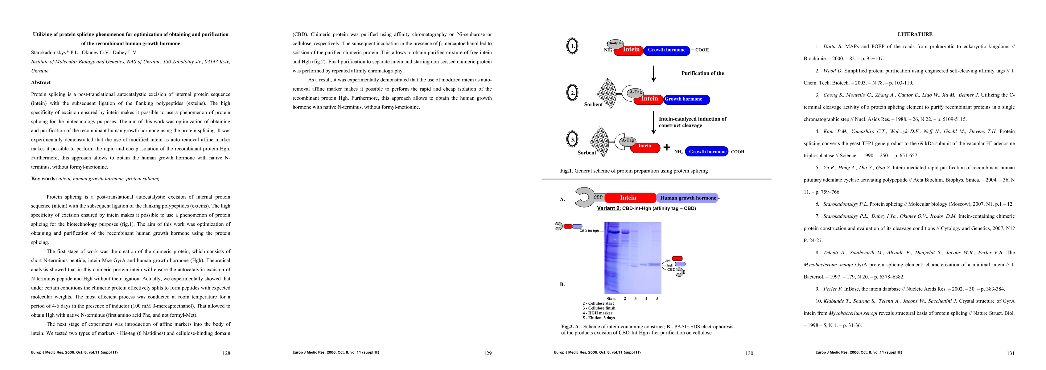 Protein splicing is a post-translational autocatalystic excision of internal protein sequence (intein) with the subsequent ligation of the flanking polypeptides (exteins). The high specificity of excision ensured by intein makes it possible to use a phenomenon of protein splicing for the biotechnology purposes. The aim of this work was optimization of obtaining and purification of the recombinant human growth hormone using the protein splicing. It was experimentally demonstrated that the use of modified intein as auto-removal affine marker makes it possible to perform the rapid and cheap isolation of the recombinant protein Hgh. Furthermore, this approach allows to obtain the human growth hormone with native N-terminus, without formyl-metionine. Key words: intein, human growth hormone, protein splicing