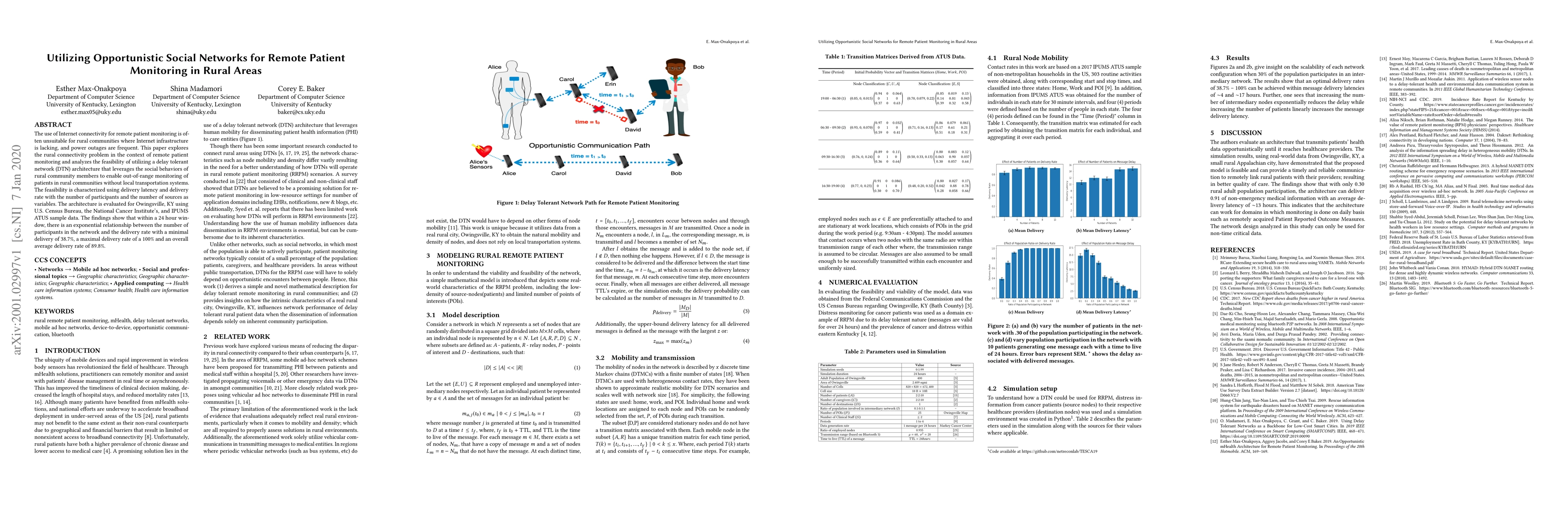 This paper investigates the use of a delay tolerant network (DTN) architecture to enable remote patient monitoring in rural areas with poor Internet infrastructure. The study finds that leveraging social networks among community members can achieve an average delivery rate of 89.8% within 24 hours, demonstrating the potential of this approach.