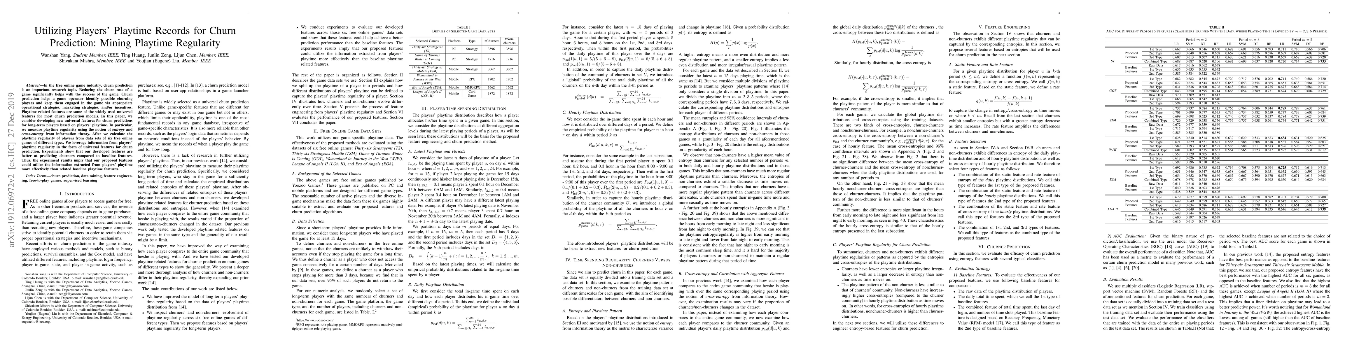 This paper explores the use of playtime regularity as a novel feature for predicting churn in long-term players of free online games. By mining playtime patterns, the study aims to enhance the accuracy of churn prediction models and improve retention strategies.